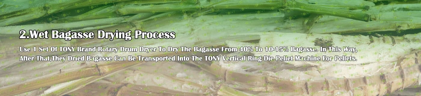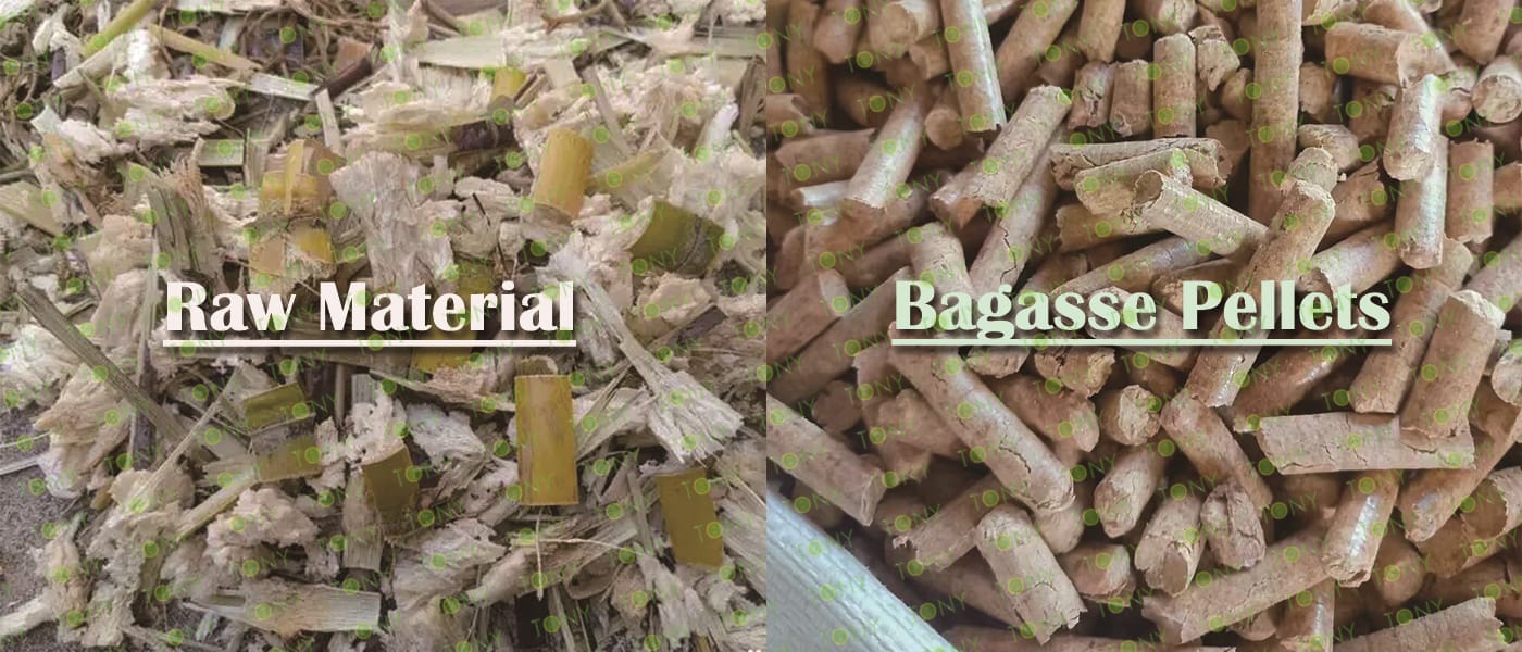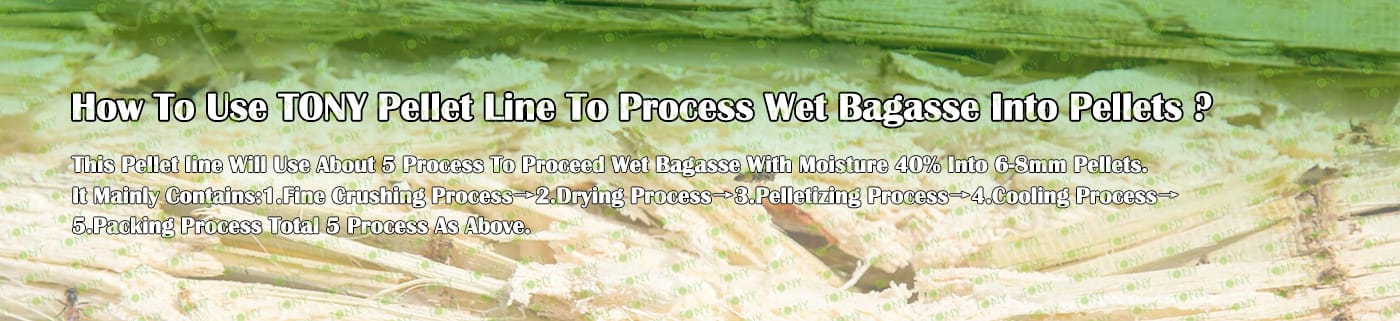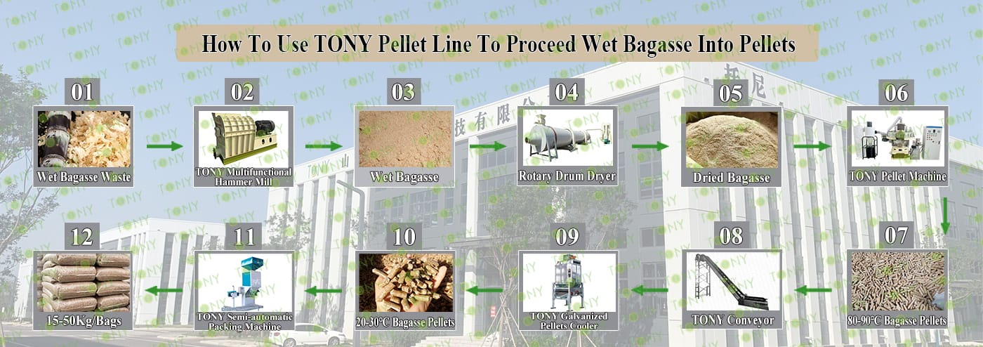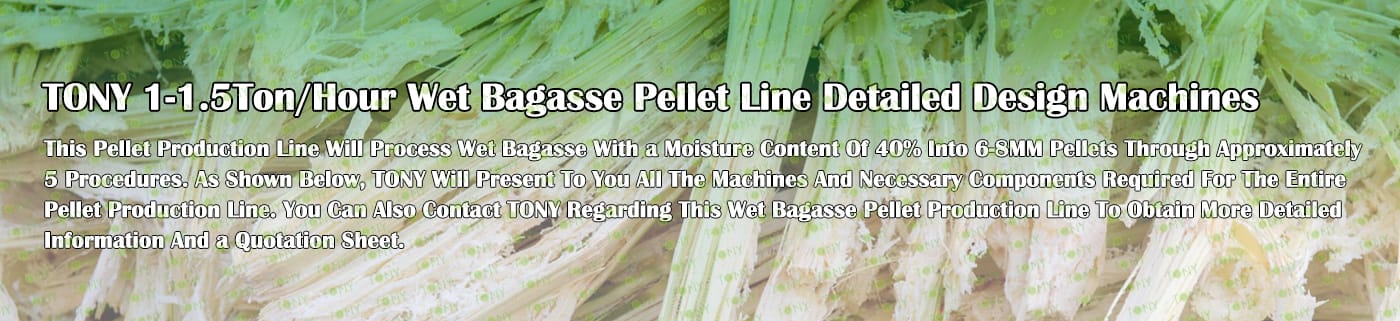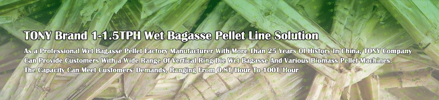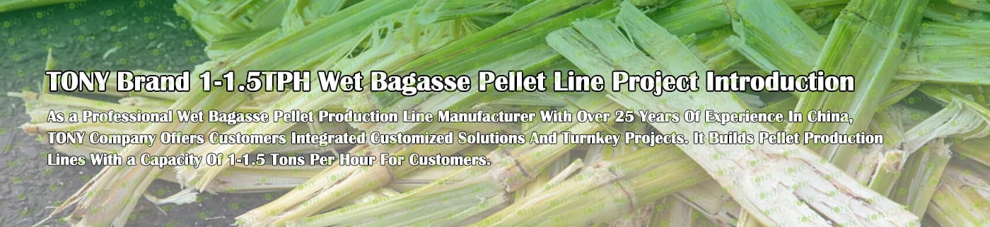 Заводът за производство на пелети за мокра багаса с марка TONY 1-1,5 тона/час може да използва мокра багаса като основна суровина. След предварителна обработка и обработка, той се втвърдява в пелетно гориво Bagasse с висока плътност. Това гориво е идеален заместител на въглищата и петрола и играе роля в енергоспестяването и намаляването на емисиите. Понастоящем той се използва широко в региони, богати на ресурси от багаса.