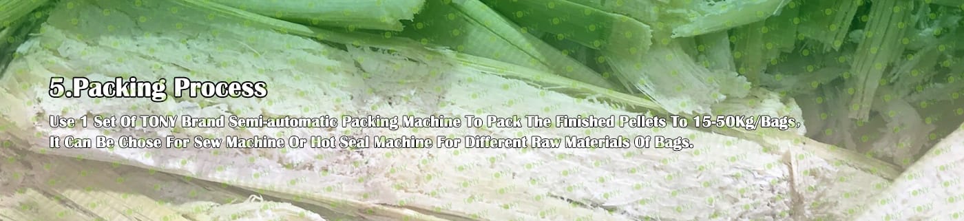 6. Основно оборудване: Многофункционална чукова мелница-TFQ65*55-37KW, Ротационна барабанна сушилня-1.2*12m, TONY Пелетна машина- TYJ551-Ⅲ-90KW, Галванизиран охладител за пелети, Полуавтоматична пакетираща машина и лентови транспортьори