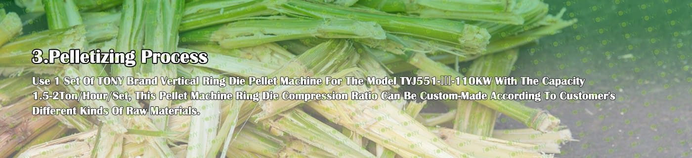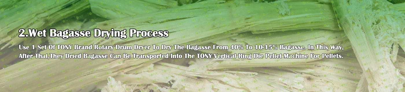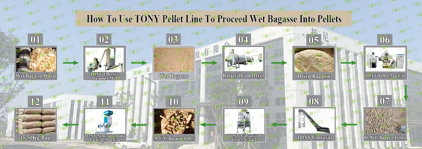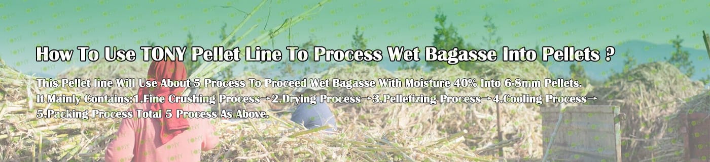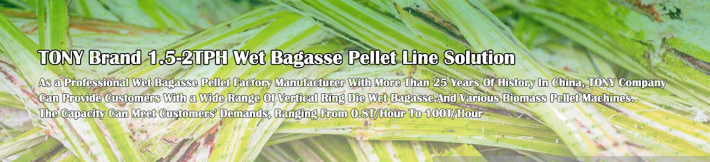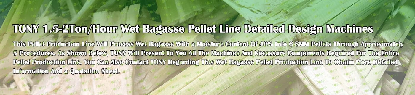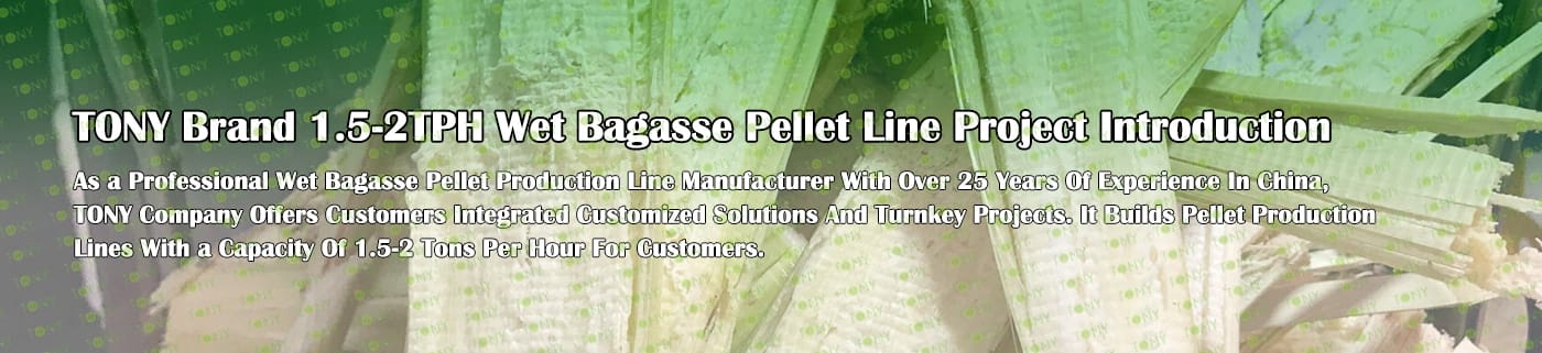 Заводът за производство на пелети за мокра багаса с марка TONY 1,5-2 тона/час може да използва мокра багаса като основна суровина. След предварителна обработка и обработка, той се втвърдява в пелетно гориво Bagasse с висока плътност. Това гориво е идеален заместител на въглищата и петрола и играе роля в енергоспестяването и намаляването на емисиите. Понастоящем той се използва широко в региони, богати на ресурси от багаса.
