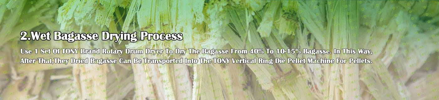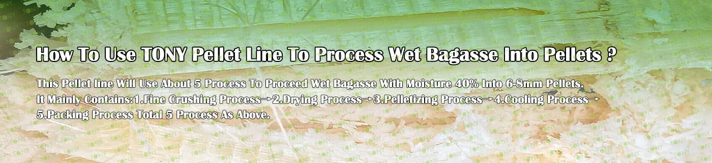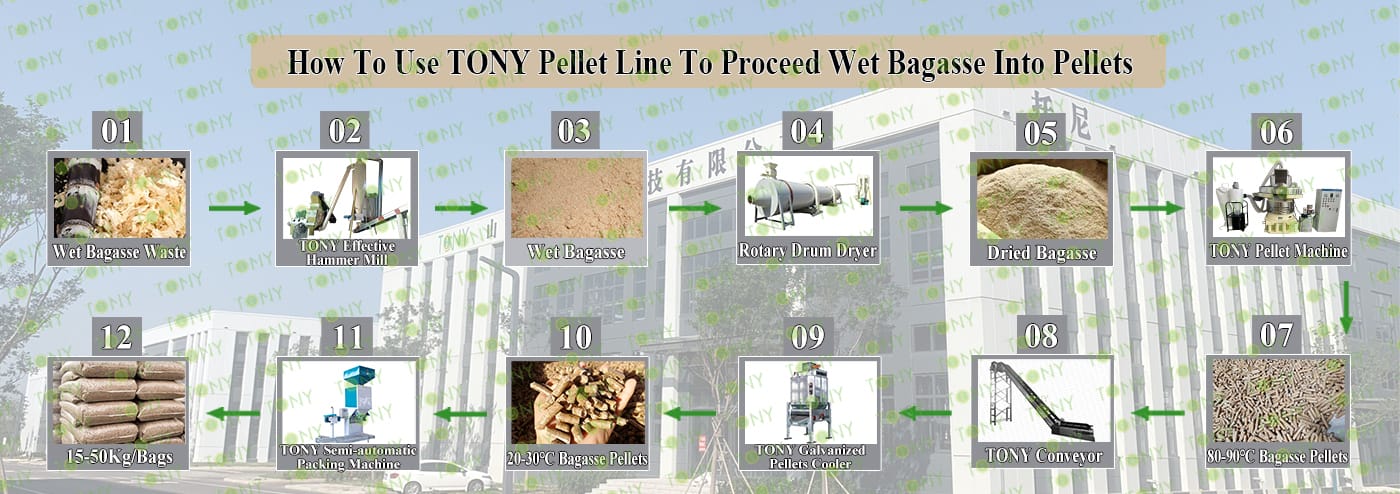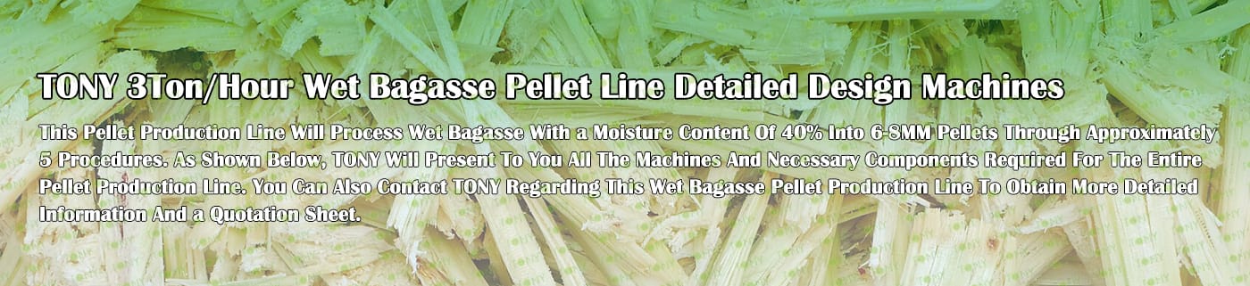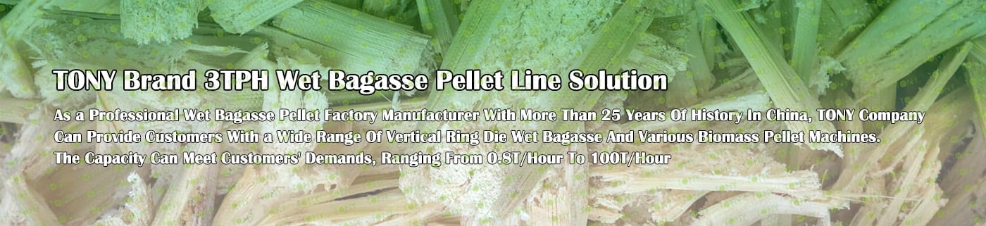 Заводът за производство на пелети за мокра багаса с марка TONY 3 тона/час може да използва мокра багаса като основна суровина. След предварителна обработка и обработка, той се втвърдява в пелетно гориво Bagasse с висока плътност. Това гориво е идеален заместител на въглищата и петрола и играе роля в енергоспестяването и намаляването на емисиите. Понастоящем той се използва широко в региони, богати на ресурси от багаса.