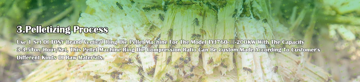 4. Основна машина: чукова мелница, сушилня с ротационен барабан, машина за пелети TONY TYJ760-Ⅲ-200KW, охладител за пелети, опаковъчна машина и лентови транспортьори