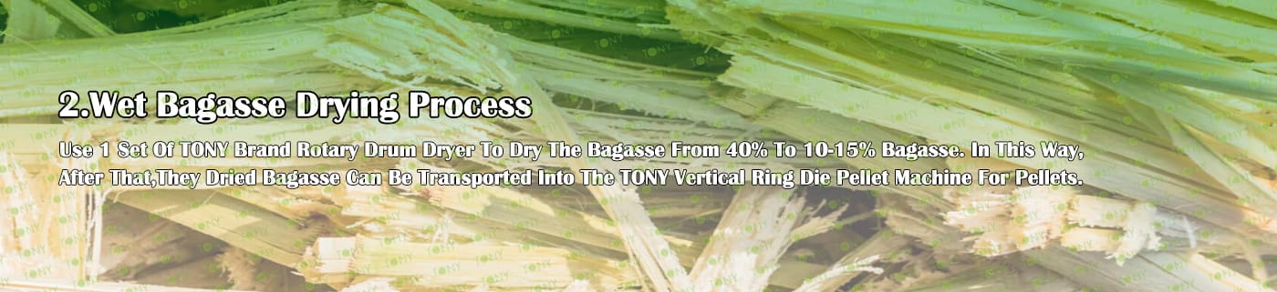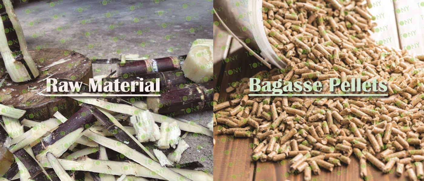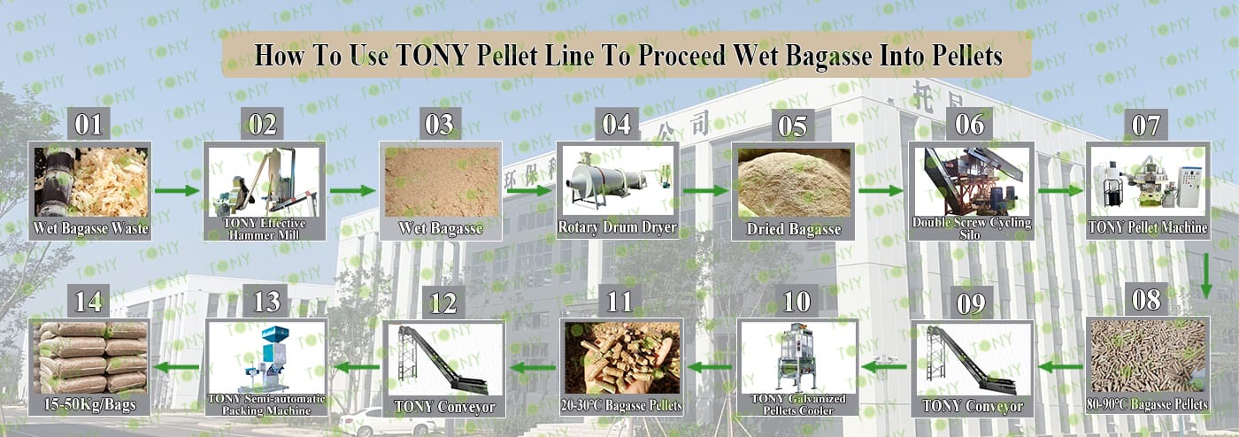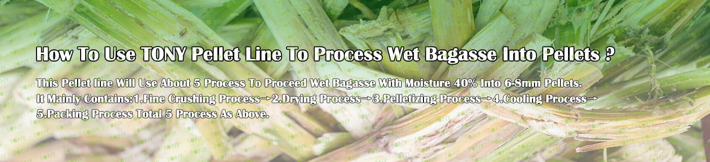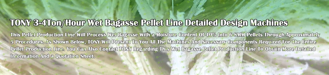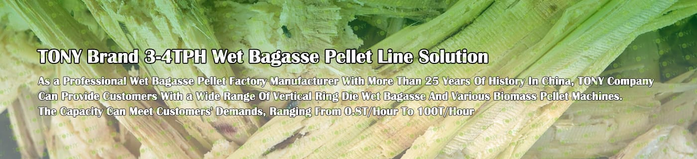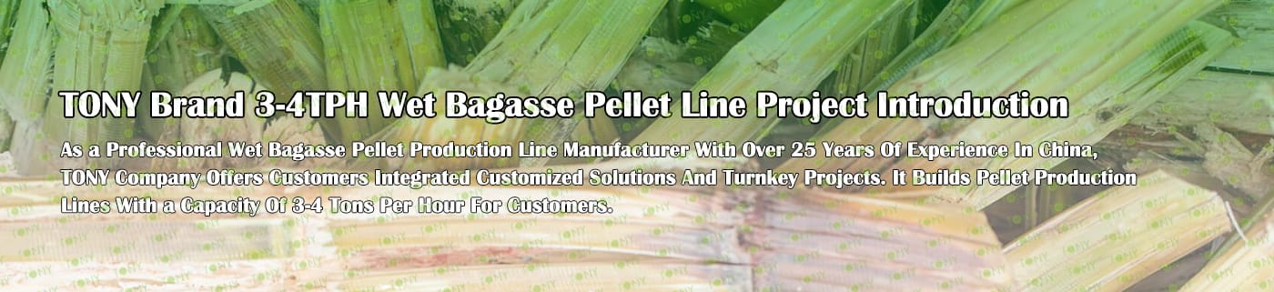 Заводът за производство на пелети за мокра багаса с марка TONY 3-4 тона/час може да използва мокра багаса като основна суровина. След предварителна обработка и обработка, той се втвърдява в пелетно гориво Bagasse с висока плътност. Това гориво е идеален заместител на въглищата и петрола и играе роля в енергоспестяването и намаляването на емисиите. Понастоящем той се използва широко в региони, богати на ресурси от багаса.