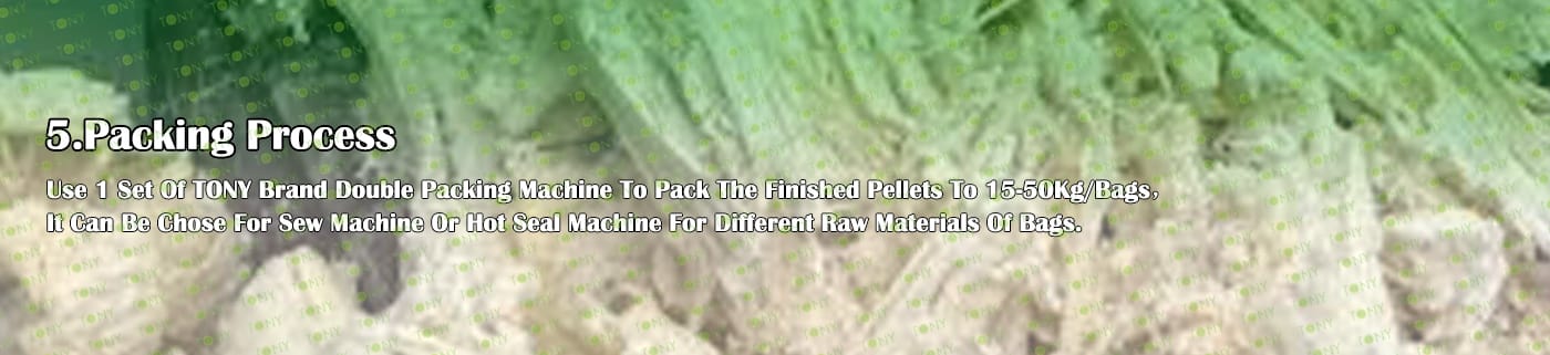 6. Основно оборудване: Ефективна чукова мелница-TFD85*220-220KW, въртяща се барабанна сушилня-2*24m, машина за пелети TONY-TYJ760-Ⅲ-200KW, охладител за поцинковани пелети, машина за двойно опаковане и лентови транспортьори