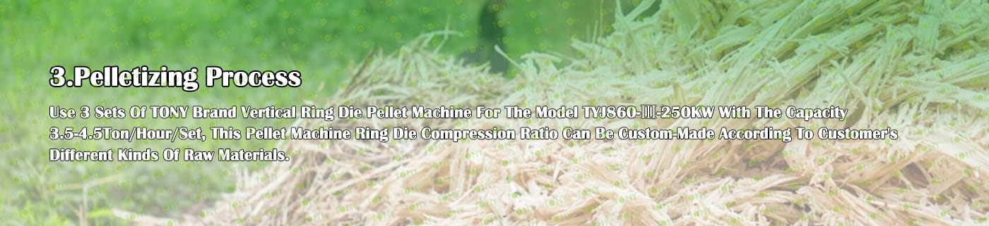 4. Основна машина: чукова мелница, сушилня с ротационен барабан, машина за пелети TONY TYJ860-Ⅲ-250KW, охладител за пелети, опаковъчна машина и лентови транспортьори