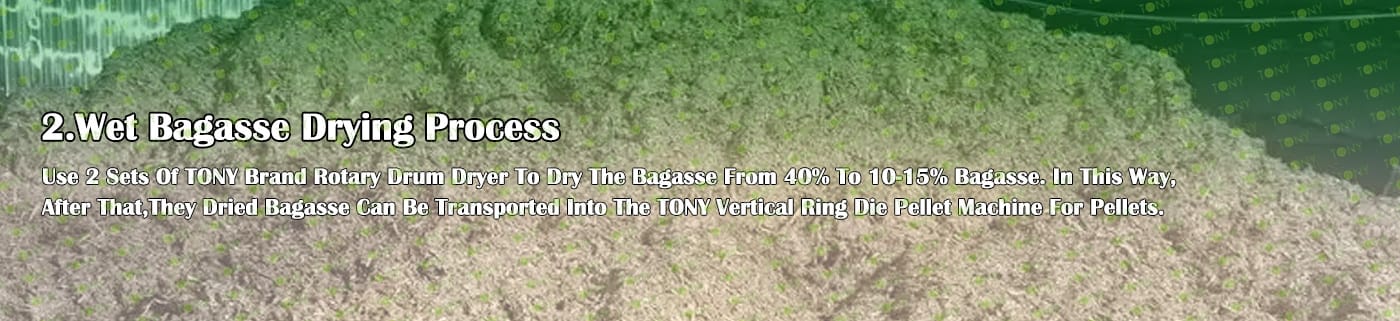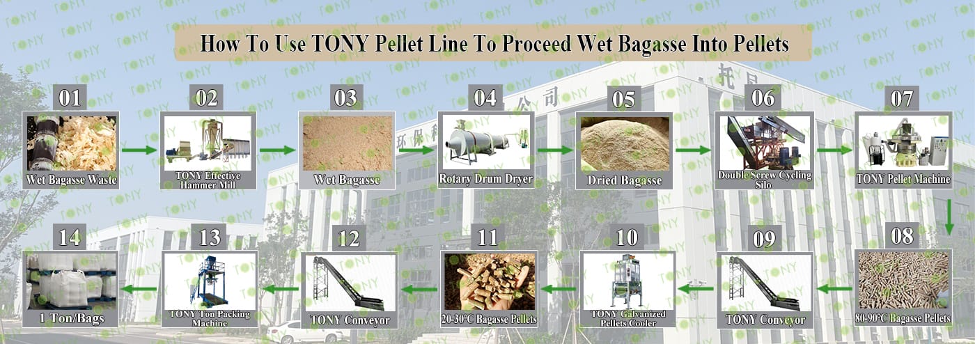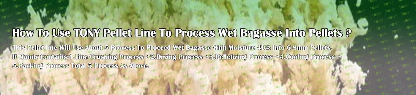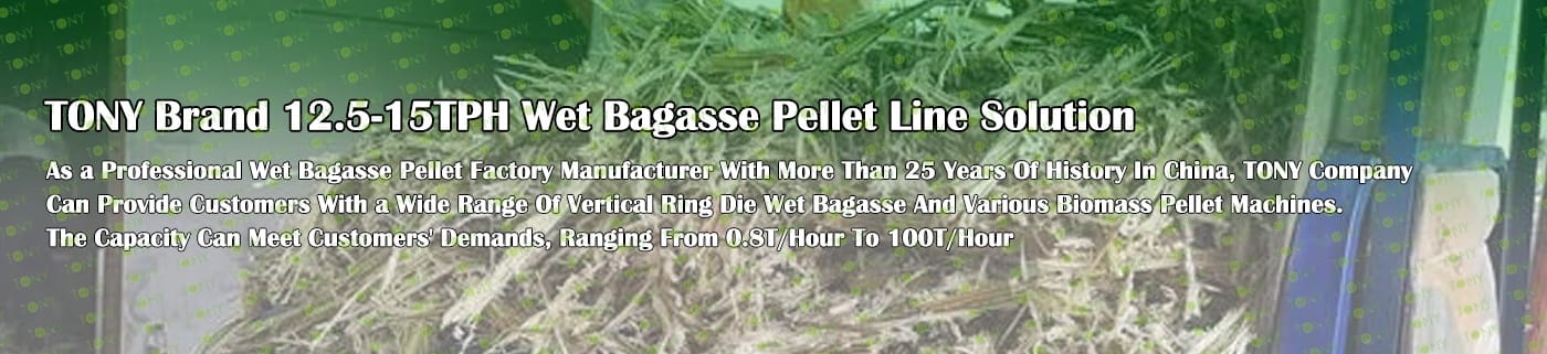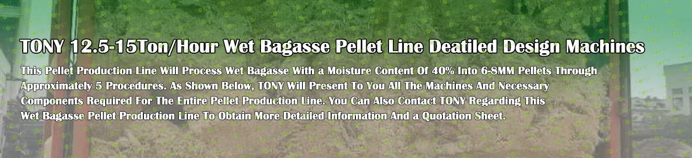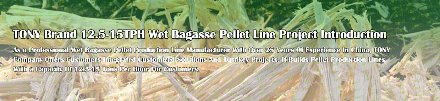 Заводът за производство на пелети за мокра багаса с марка TONY 12,5-15 тона/час може да използва мокра багаса като основна суровина. След предварителна обработка и обработка, той се втвърдява в пелетно гориво Bagasse с висока плътност. Това гориво е идеален заместител на въглищата и петрола и играе роля в енергоспестяването и намаляването на емисиите. Понастоящем той се използва широко в региони, богати на ресурси от багаса.