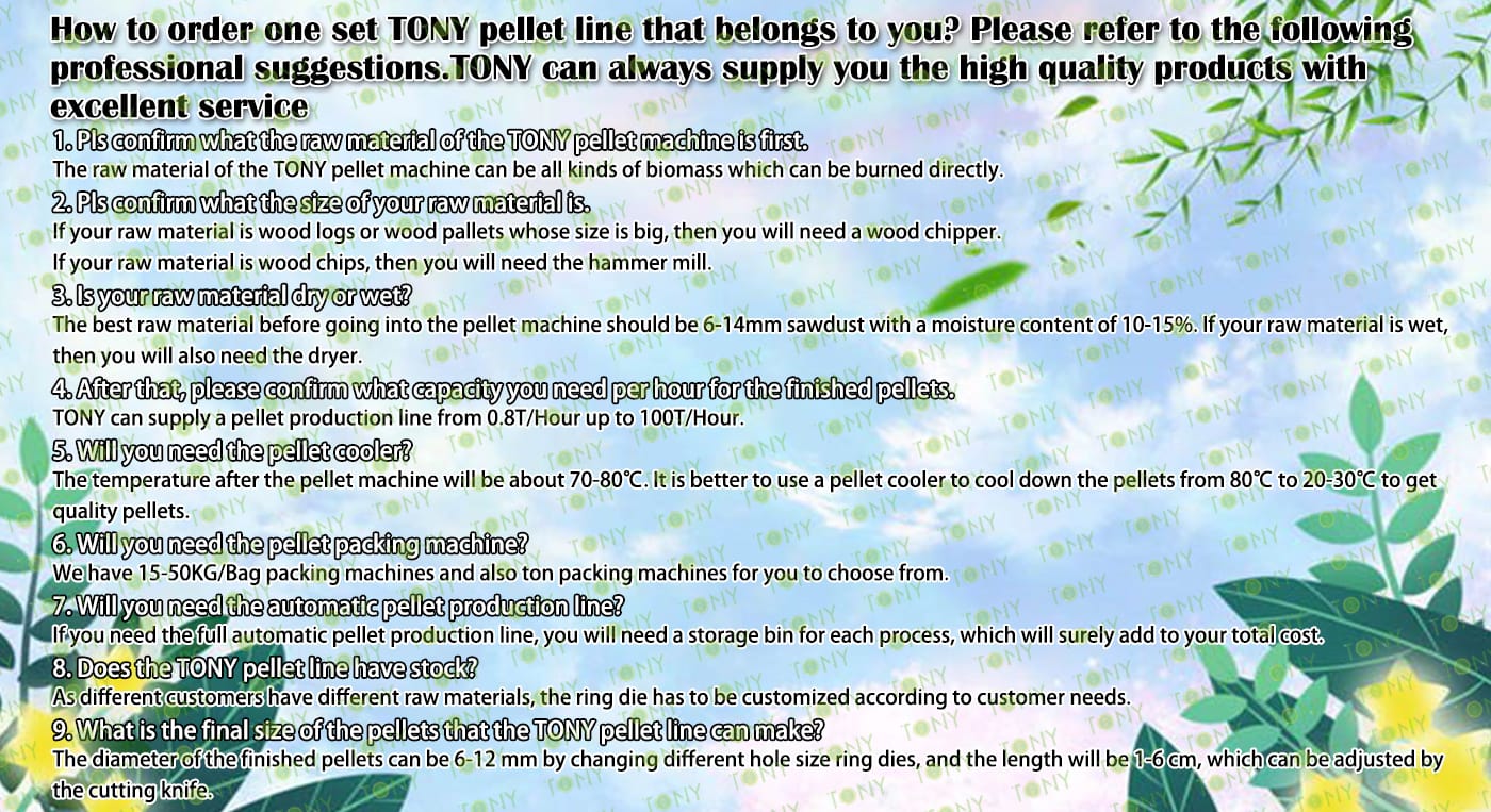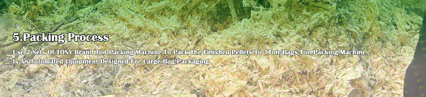 6. Основно оборудване: Ефективна чукова мелница-TFD85*250-250KW, въртяща се барабанна сушилня-2,5*24m, машина за пелети TONY-TYJ860-Ⅲ-250KW, охладител за поцинковани пелети, машина за пакетиране на тонове и лентови транспортьори