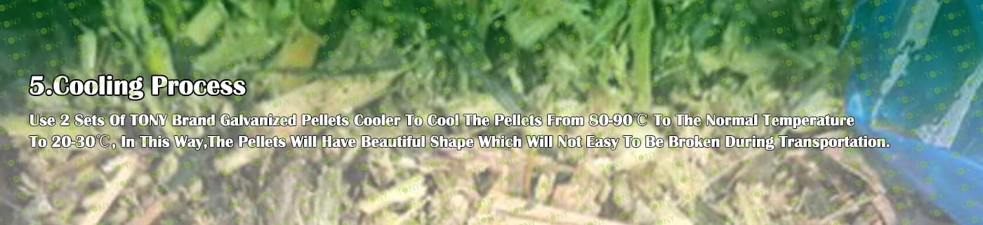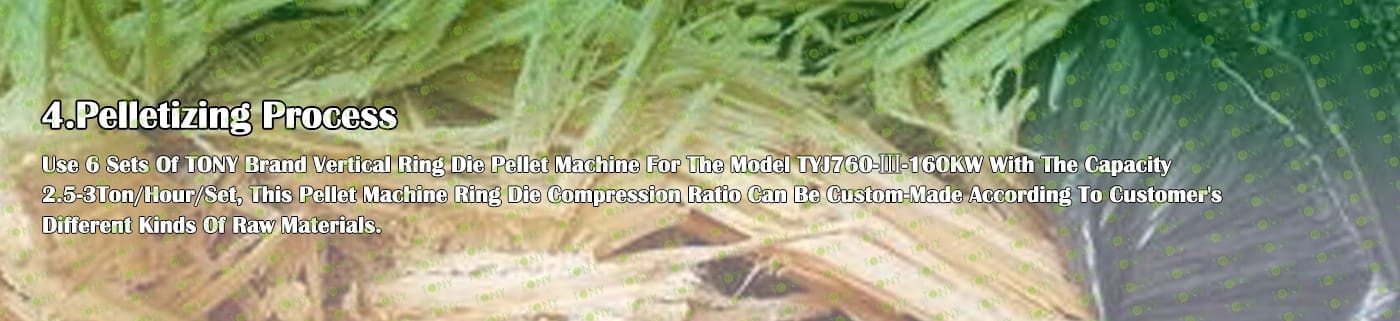 4. Основна машина: чукова мелница, голям хидравличен силоз за съхранение, сушилня с ротационен барабан, машина за пелети TONY TYJ760-Ⅲ-160KW, охладител за пелети, опаковъчна машина и лентови транспортьори
