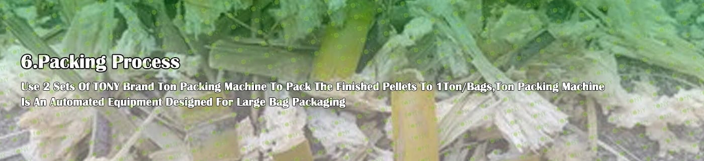 6. Основно оборудване: Ефективна чукова мелница-TFD85*250-250KW, голям хидравличен силоз за съхранение TONY, сушилня с ротационен барабан-2,5*24m, машина за пелети TONY- TYJ760-Ⅲ-160KW, охладител за поцинковани пелети, машина за пакетиране на тонове и лентови транспортьори