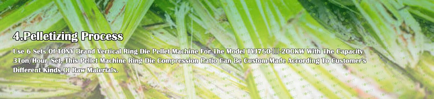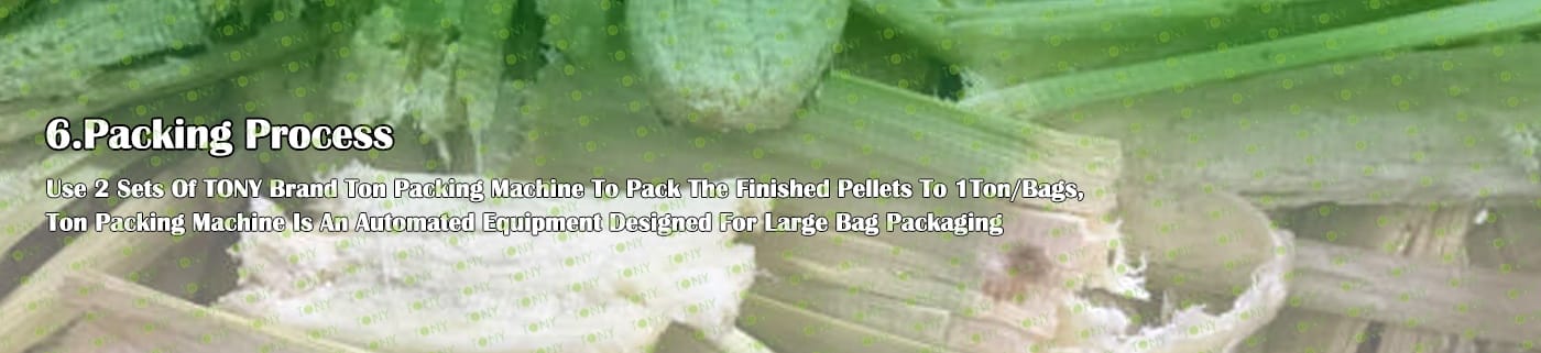 6. Основно оборудване: Ефективна чукова мелница-TFD75*132-132KW, голям хидравличен силоз за съхранение TONY, сушилня с въртящ се барабан-2,8*24m, машина за пелети TONY- TYJ760-Ⅲ-200KW, охладител за поцинковани пелети, машина за пакетиране на тонове и лентови транспортьори