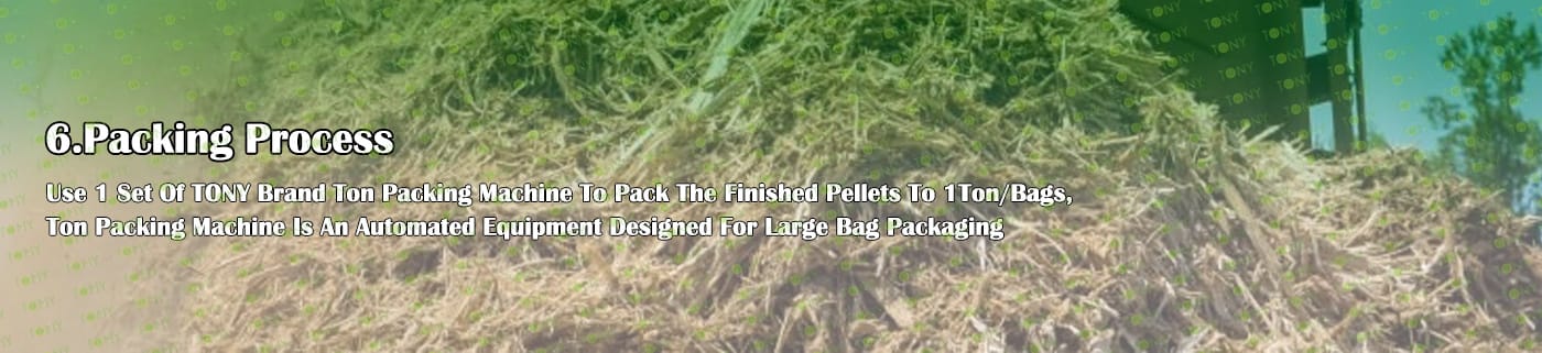 6. Основно оборудване: Ефективна чукова мелница-TFD75*160-160KW, голям хидравличен силоз за съхранение TONY, сушилня с ротационен барабан-2,2*24m, пелетна машина TONY- TYJ860-Ⅲ-280KW, охладител за поцинковани пелети, машина за опаковане на тонове и лентови транспортьори