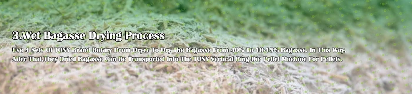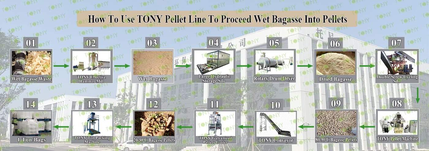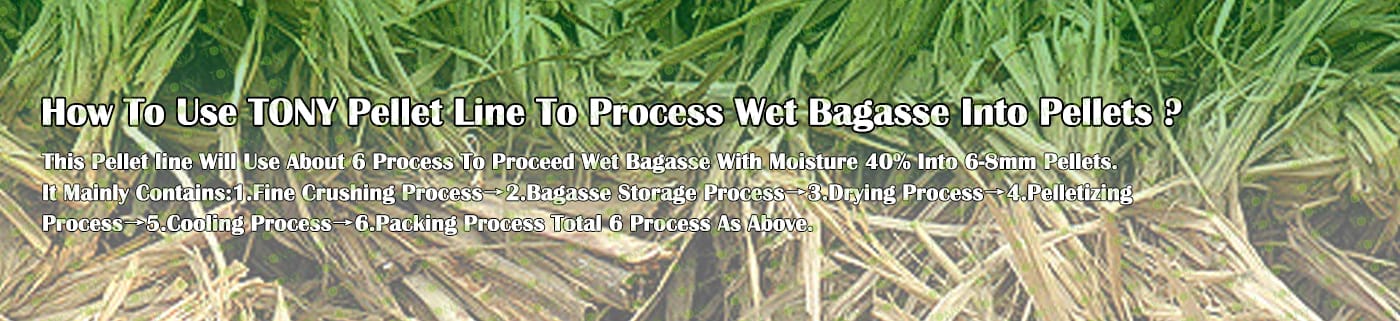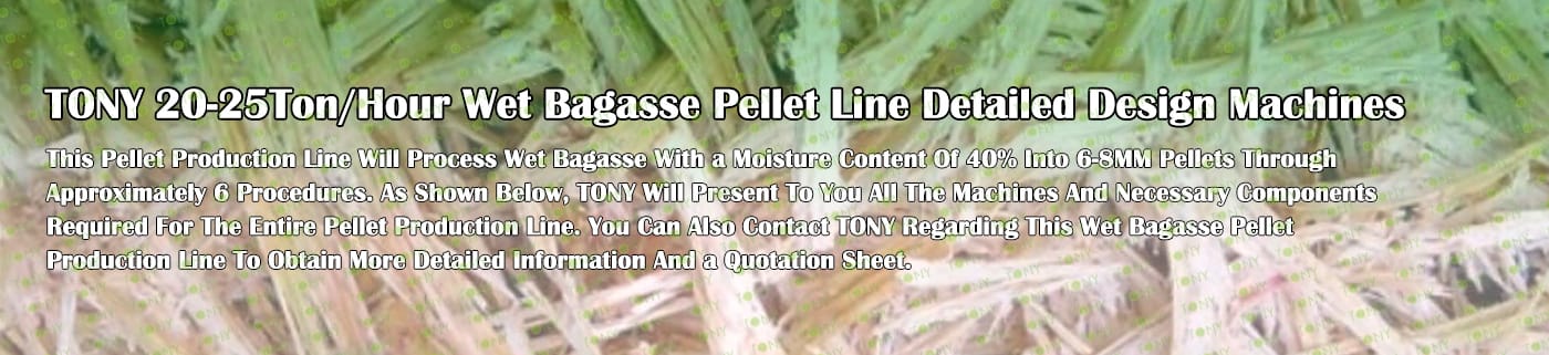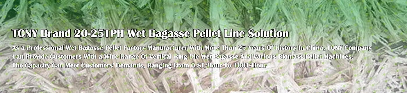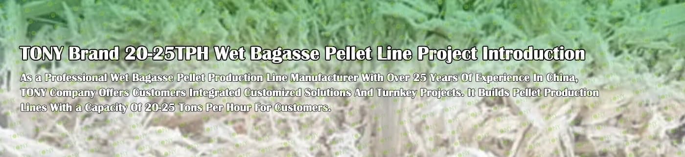 Заводът за производство на пелети за мокра багаса с марка TONY 20-25 тона/час може да използва мокра багаса като основна суровина. След предварителна обработка и обработка, той се втвърдява в пелетно гориво Bagasse с висока плътност. Това гориво е идеален заместител на въглищата и петрола и играе роля в енергоспестяването и намаляването на емисиите. Понастоящем той се използва широко в региони, богати на ресурси от багаса.
