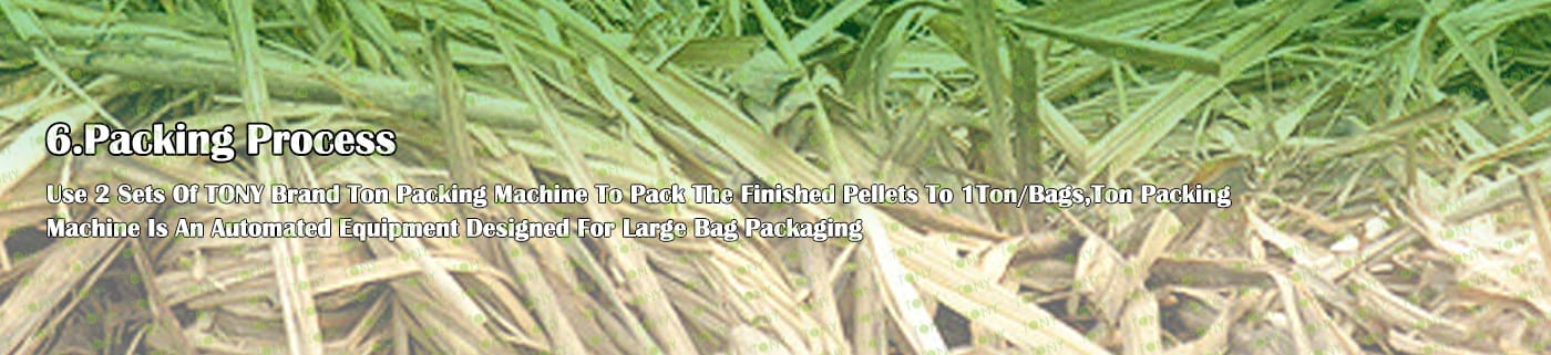 6. Основно оборудване: Ефективна чукова мелница-TFD85*220-220KW, голям хидравличен силоз за съхранение TONY, ротационна барабанна сушилня-2*24m, машина за пелети TONY-TYJ860-Ⅲ-280KW, охладител за поцинковани пелети, машина за пакетиране на тонове и лентови транспортьори