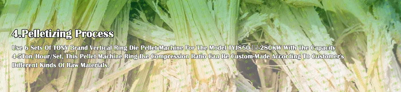 | 1. За пресоване на суха багаса в 6-8 mm пелети от биомаса 2.Модел: TYJ860-III-280KW*6 комплекта 3.Капацитет:4-5Тон/час/комплект 4.NEW 304SS Тип |