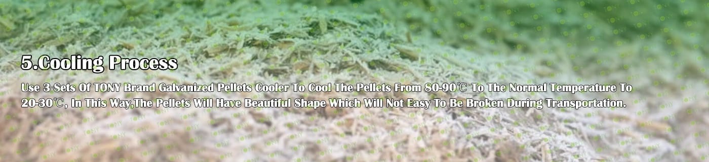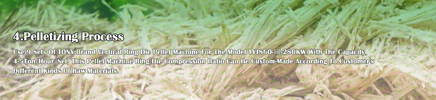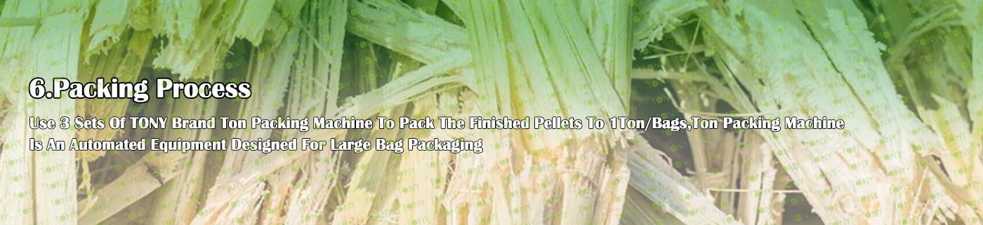 6. Основно оборудване: Ефективна чукова мелница-TFD100*200-315KW, голям хидравличен силоз за съхранение TONY, сушилня с ротационен барабан-3,2*24m, машина за пелети TONY- TYJ860-Ⅲ-280KW, охладител за поцинковани пелети, машина за пакетиране на тонове и лентови транспортьори