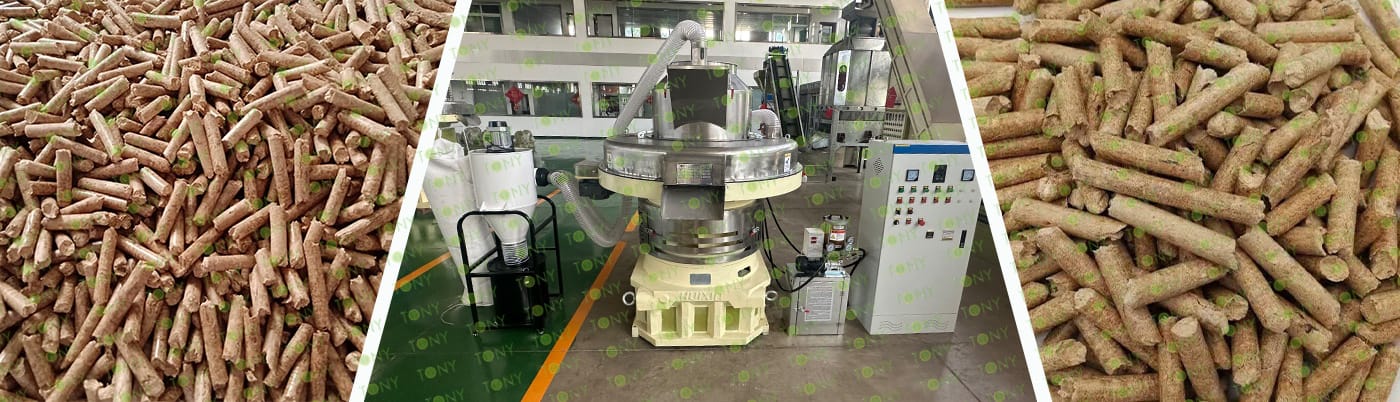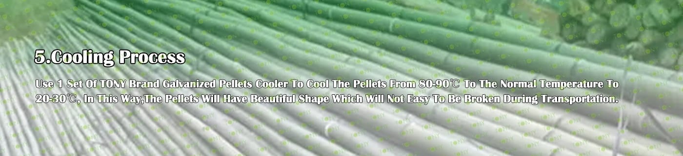4. Основна машина: Изчерпателна дробилка, чукова мелница, ротационна барабанна сушилня, пелетна машина TONY TYJ860-Ⅲ-250KW, охладител за пелети, опаковъчна машина и лентови транспортьори