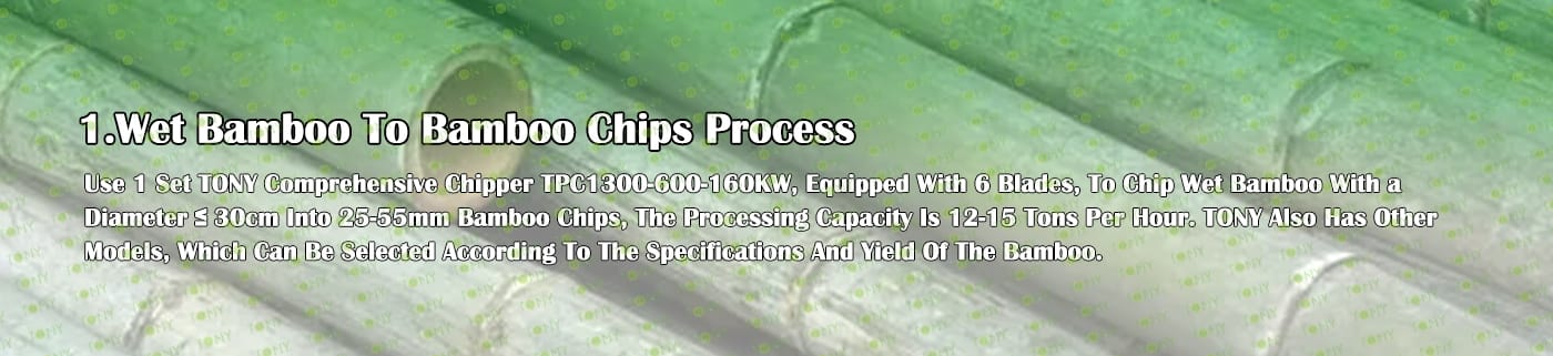 A. Този процес се използва главно за смилане на бамбук, чийто диаметър е под 30 см, в бамбукови чипове с размер 25-55 мм. Размерът на крайния бамбуков чипс може да се регулира чрез смяна на различни размери на ситата и добавяне на летящи ножове вътре в машината за дробене на дървесина.