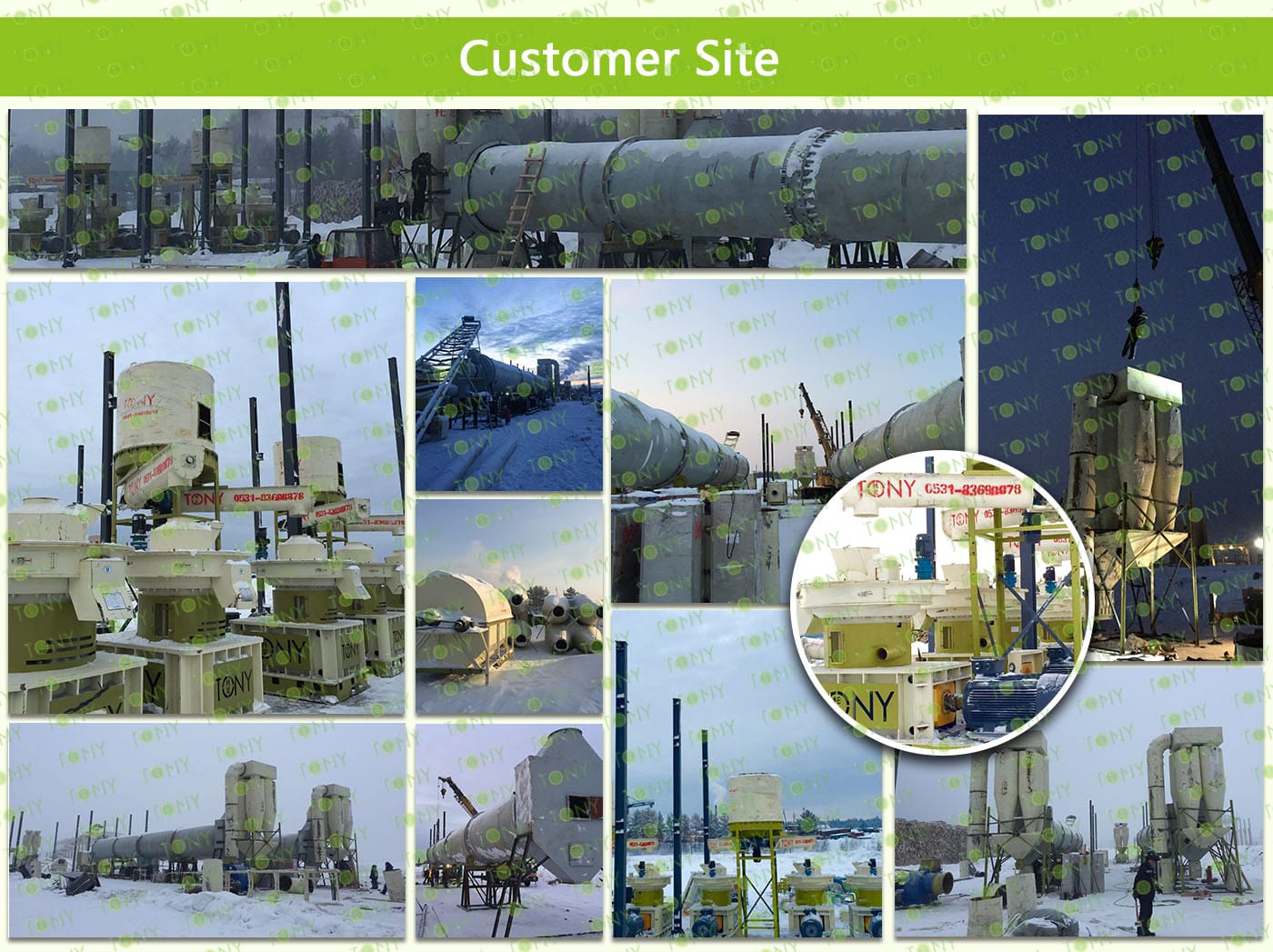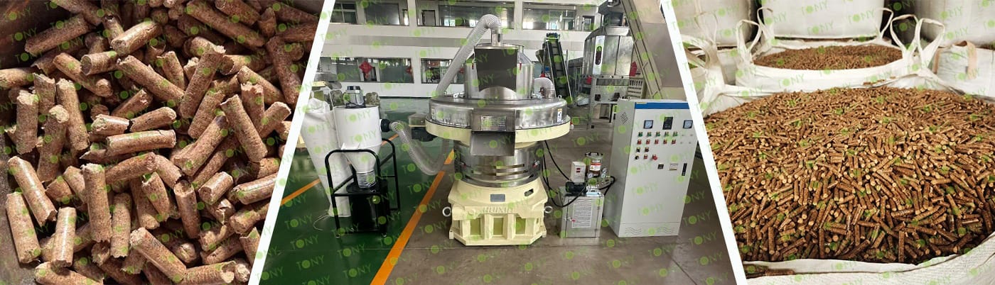 4. Основна машина: цялостен дробилка, чукова мелница, ротационна барабанна сушилня, пелетна машина TONY TYJ860-Ⅲ-220KW, охладител за пелети, опаковъчна машина и лентови транспортьори