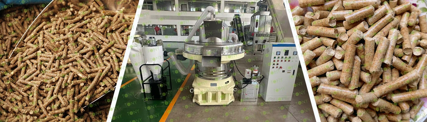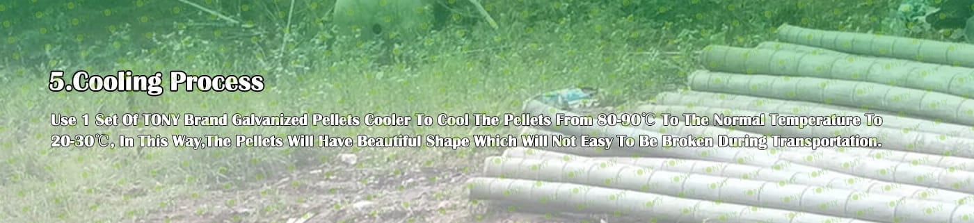 4. Основна машина: Изчерпателна дробилка, чукова мелница, ротационна барабанна сушилня, пелетна машина TONY TYJ760-Ⅲ-200KW, охладител за пелети, опаковъчна машина и лентови транспортьори