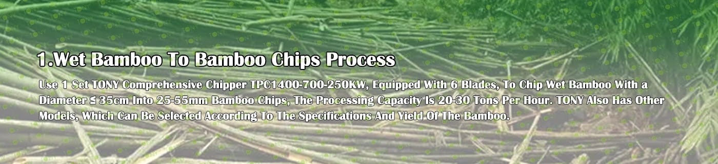 A. Този процес се използва главно за смилане на бамбук, чийто диаметър е под 35 см, в бамбукови чипове с размер 25-55 мм. Размерът на финишния бамбуков чипс може да се регулира чрез промяна на различни размери на сита и добавяне на летящи ножове в машината за дробене на дървесина.