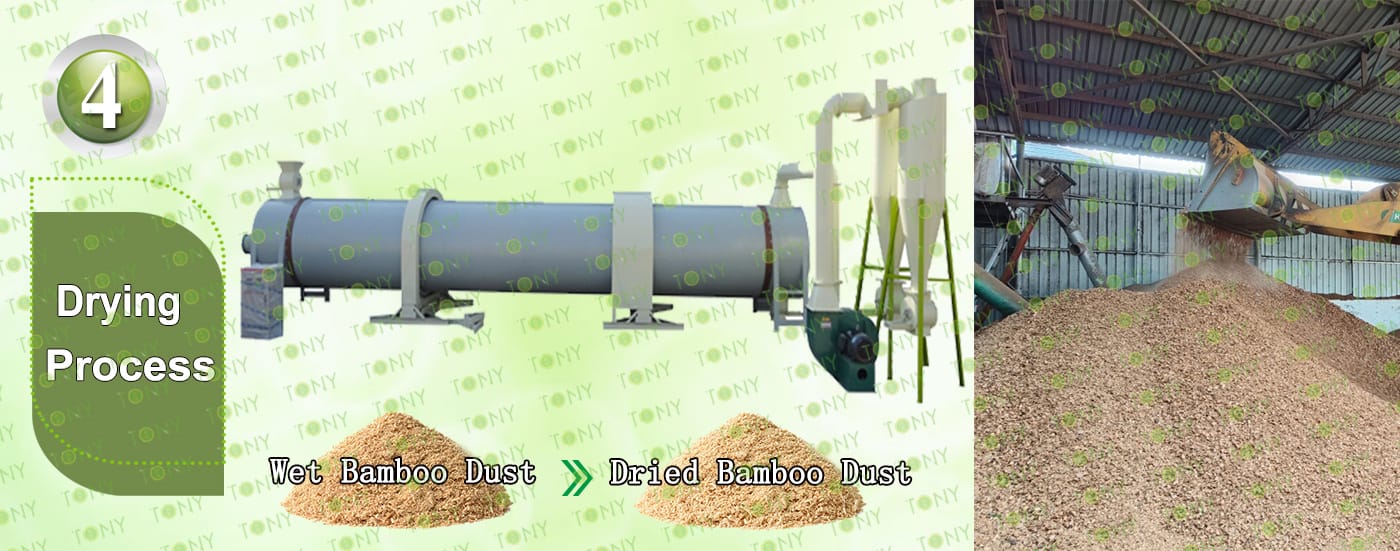 Съдържанието на влага в мокрия бамбук е 40% -60%. Оборудването за сушене трябва да балансира между „бърза дехидратация“ и „избягване на коксуване на бамбуков прах“. Характеристиките му са „достатъчен топлообмен, прецизен контрол на температурата и чисти отработени газове“.
