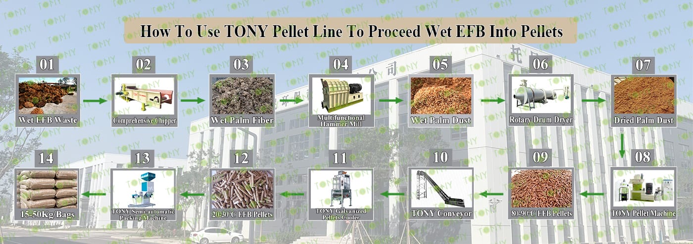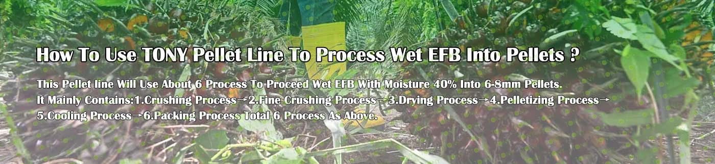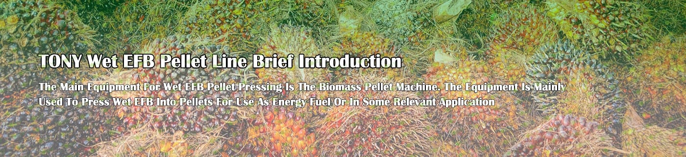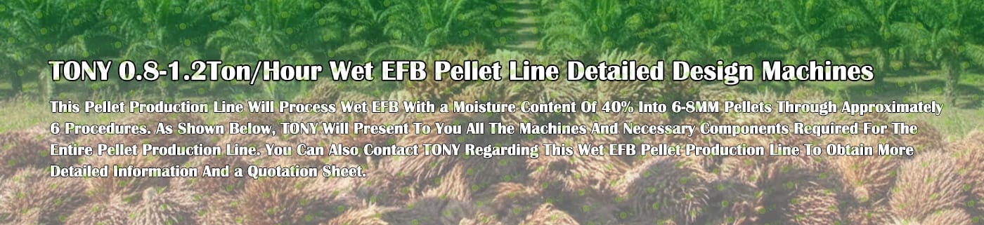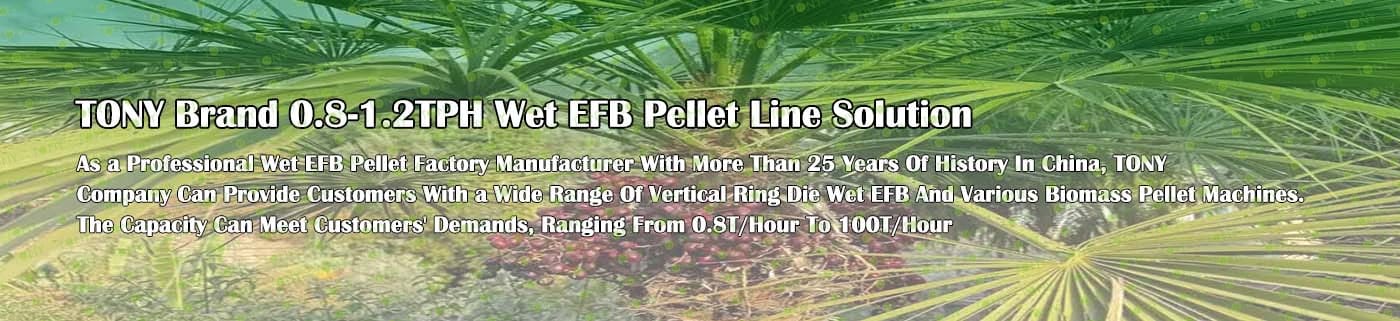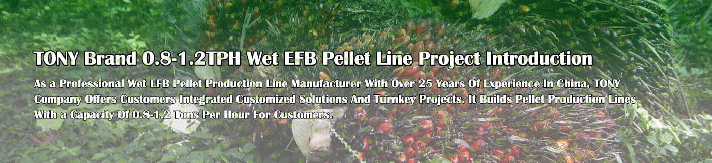 Заводът за производство на пелети с мокър EFB с марка TONY 0,8-1,2 тона/час може да използва мокър EFB като основна суровина. След предварителна обработка и обработка се втвърдява в пелетно гориво EFB с висока плътност. Това гориво е идеален заместител на въглищата и петрола и играе роля в енергоспестяването и намаляването на емисиите. Понастоящем той се използва широко в региони, богати на EFB ресурси.