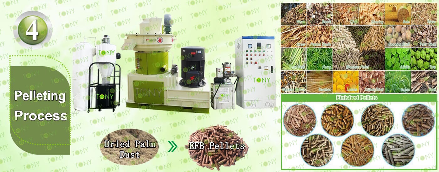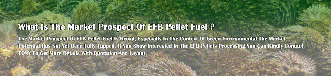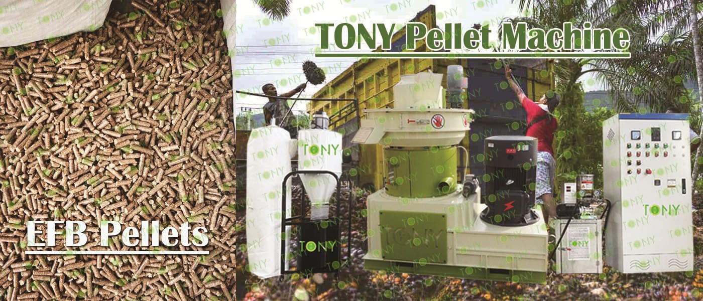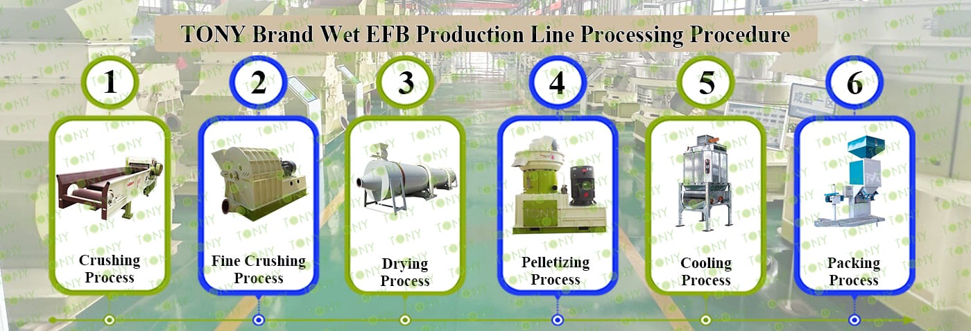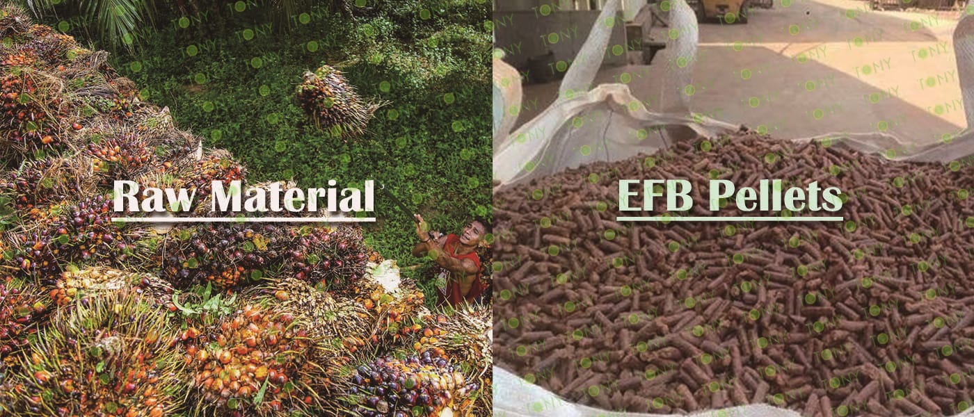 Заводът за производство на пелети с мокър EFB с марка TONY 0,8-1,2 тона/час може да използва мокър EFB като основна суровина. След предварителна обработка и обработка се втвърдява в пелетно гориво EFB с висока плътност. Това гориво е идеален заместител на въглищата и петрола и играе роля в енергоспестяването и намаляването на емисиите. Понастоящем той се използва широко в региони, богати на EFB ресурси.
