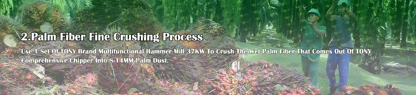 A. Този процес се използва главно за смачкване на 25-55 mm палмови влакна в 8-14 mm палмов прах.
