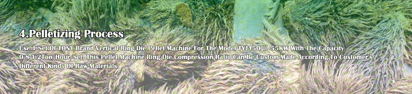 4. Основна машина: цялостна дробилка, чукова мелница, сушилня с ротационен барабан, машина за пелети TONY TYJ450-Ⅱ-55KW, охладител за пелети, опаковъчна машина и лентови транспортьори