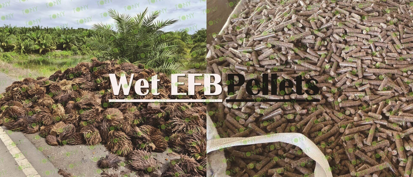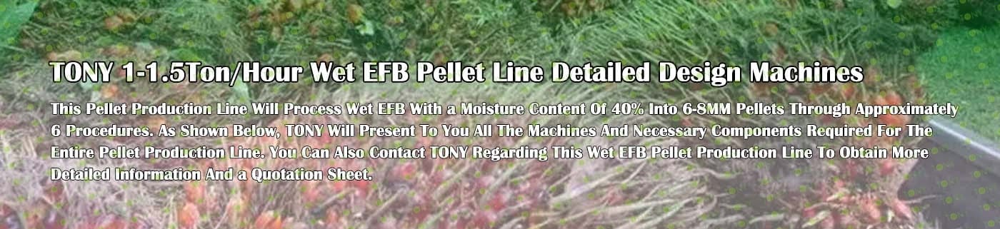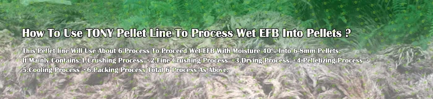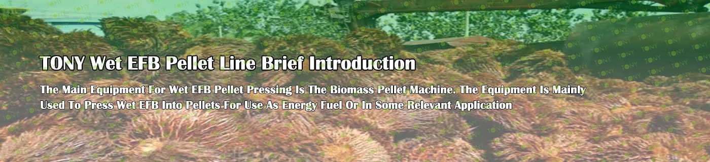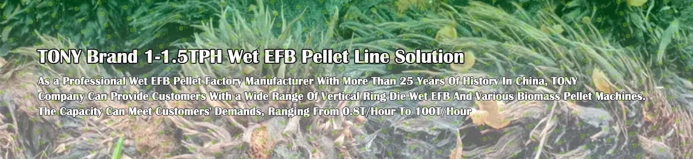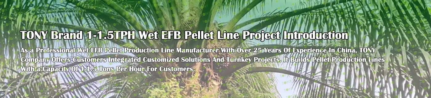Заводът за производство на пелети с мокър EFB с марка TONY 1-1,5 тона/час може да използва мокър EFB като основна суровина. След предварителна обработка и обработка се втвърдява в пелетно гориво EFB с висока плътност. Това гориво е идеален заместител на въглищата и петрола и играе роля в енергоспестяването и намаляването на емисиите. Понастоящем той се използва широко в региони, богати на EFB ресурси.