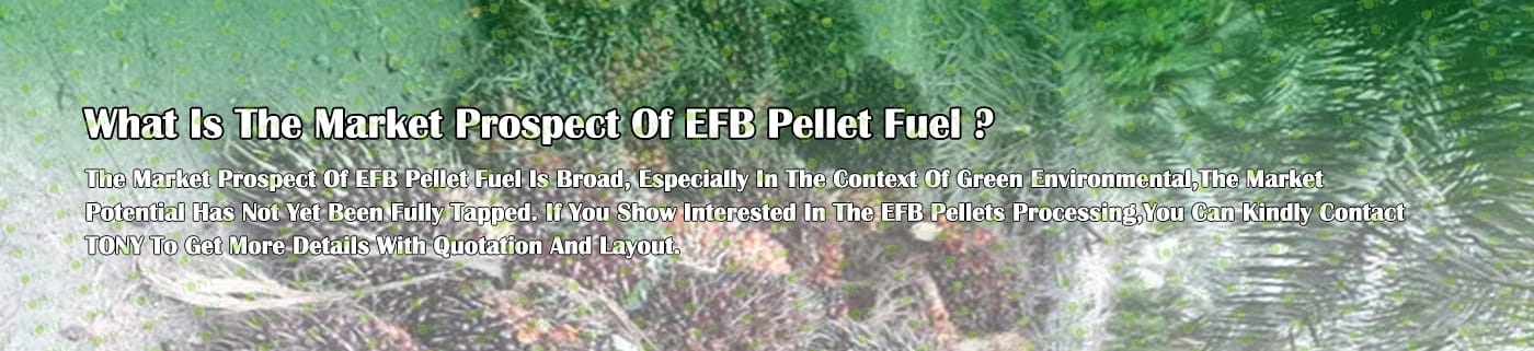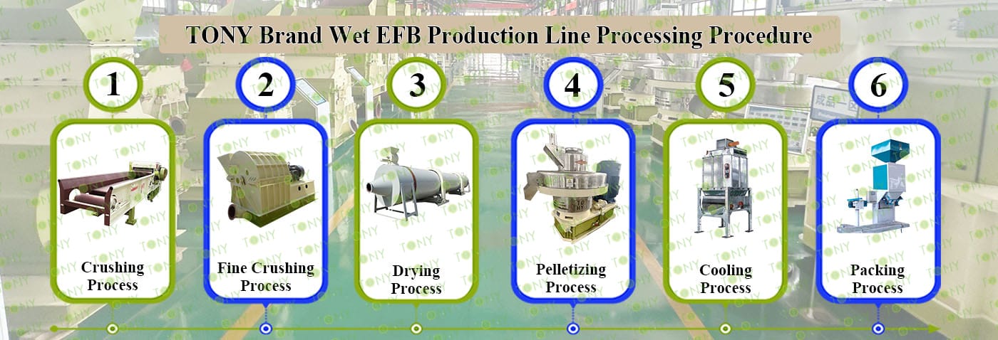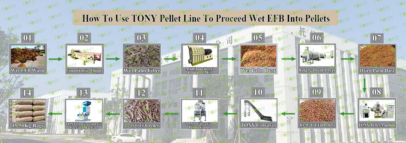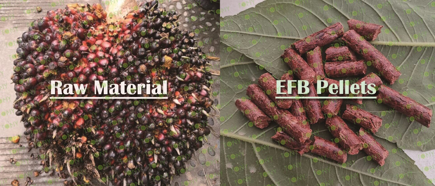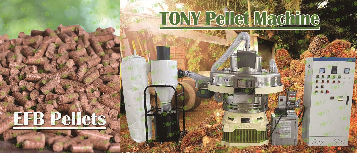 Заводът за производство на пелети с мокър EFB с марка TONY 1-1,5 тона/час може да използва мокър EFB като основна суровина. След предварителна обработка и обработка се втвърдява в пелетно гориво EFB с висока плътност. Това гориво е идеален заместител на въглищата и петрола и играе роля в енергоспестяването и намаляването на емисиите. Понастоящем той се използва широко в региони, богати на EFB ресурси.