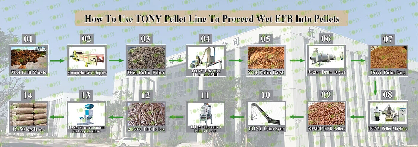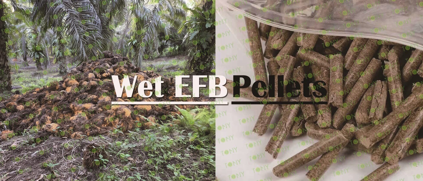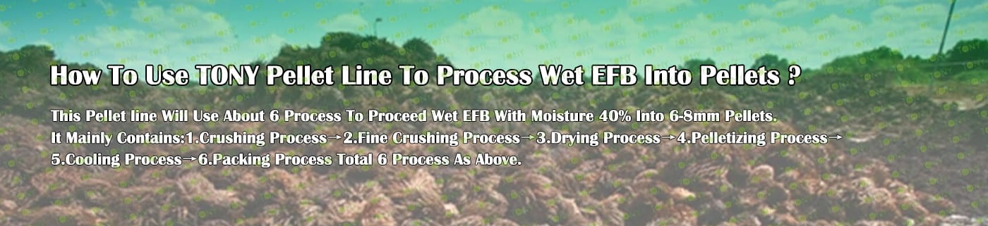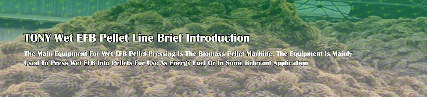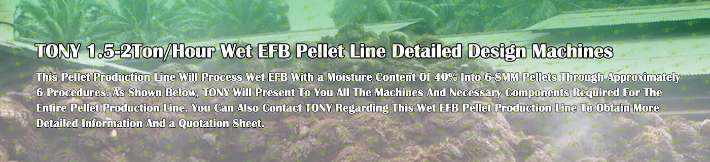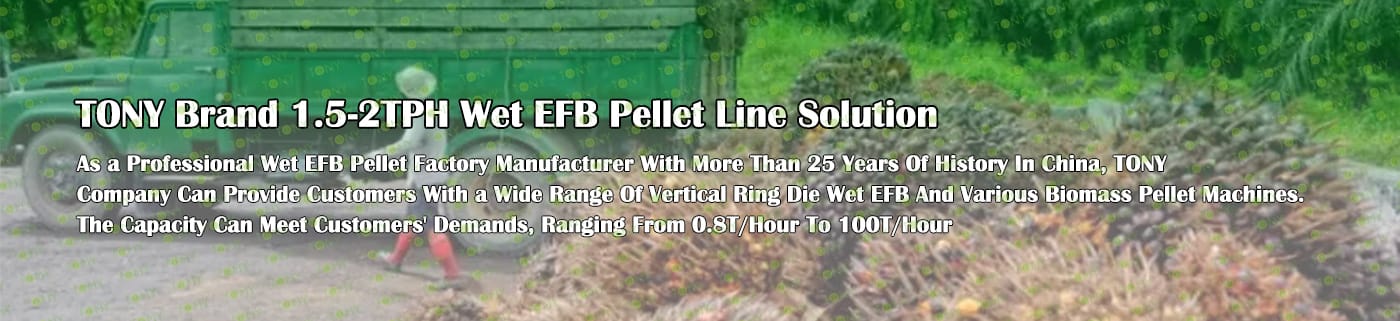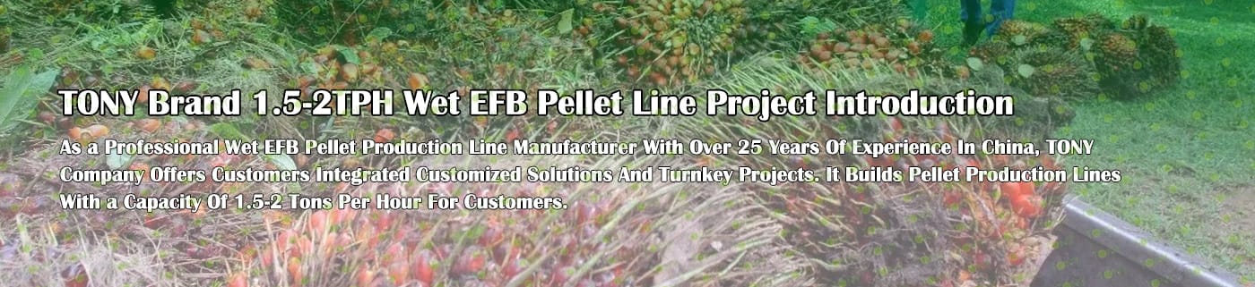Заводът за производство на пелети с мокър EFB с марка TONY 1,5-2 тона/час може да използва мокър EFB като основна суровина. След предварителна обработка и обработка се втвърдява в пелетно гориво EFB с висока плътност. Това гориво е идеален заместител на въглищата и петрола и играе роля в енергоспестяването и намаляването на емисиите. Понастоящем той се използва широко в региони, богати на EFB ресурси.
