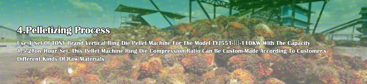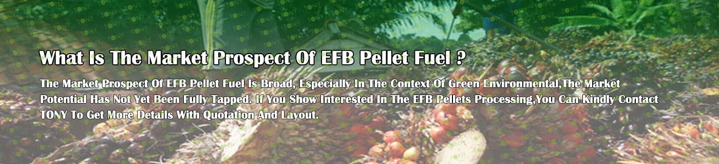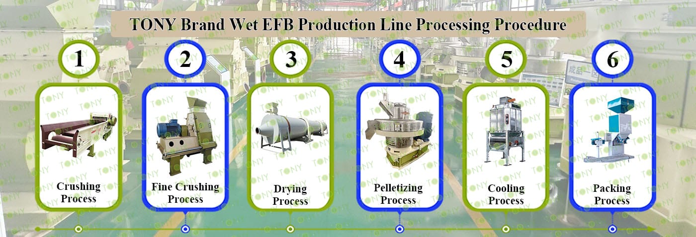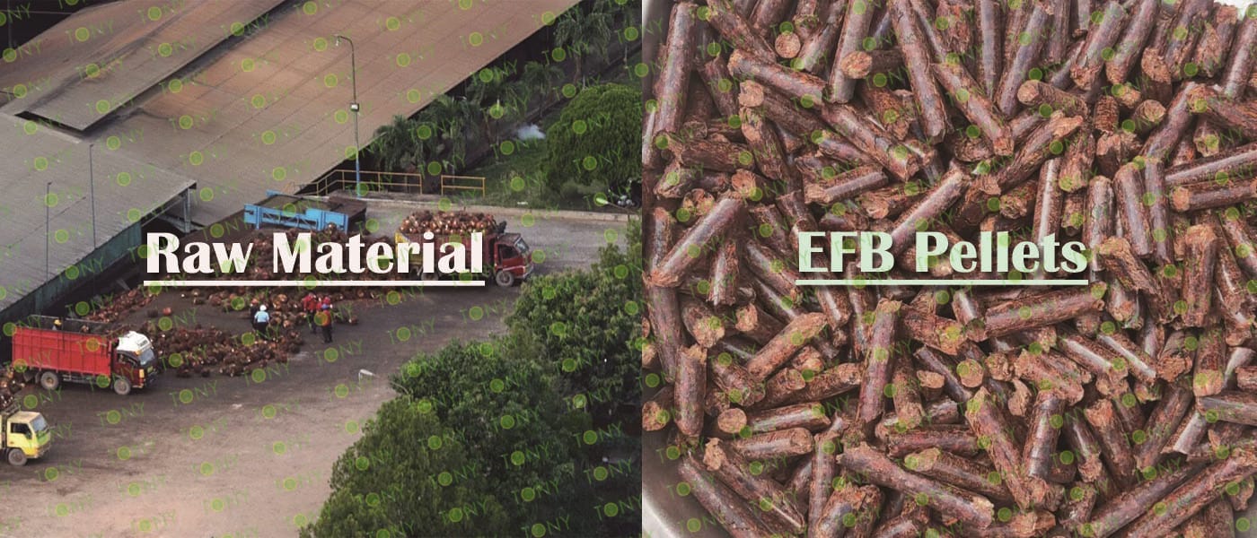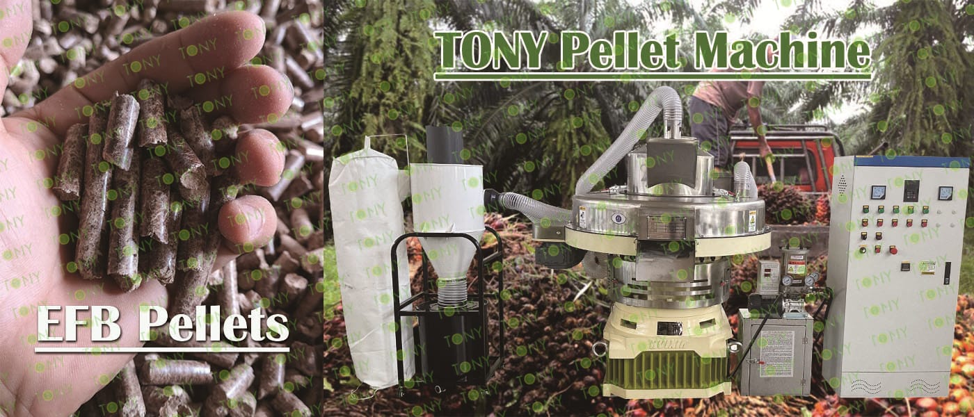 Заводът за производство на пелети с мокър EFB с марка TONY 1,5-2 тона/час може да използва мокър EFB като основна суровина. След предварителна обработка и обработка се втвърдява в пелетно гориво EFB с висока плътност. Това гориво е идеален заместител на въглищата и петрола и играе роля в енергоспестяването и намаляването на емисиите. Понастоящем той се използва широко в региони, богати на EFB ресурси.