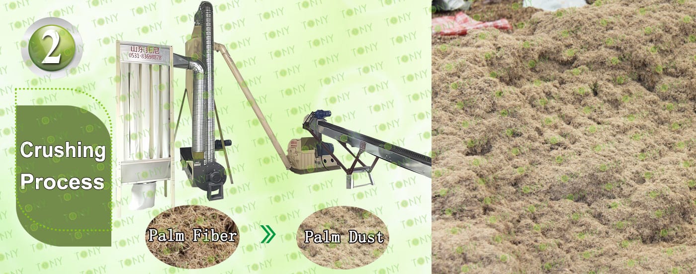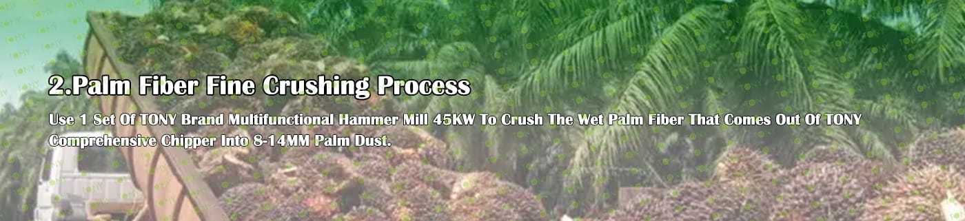 A. Този процес се използва главно за смачкване на 25-55 mm палмови влакна в 8-14 mm палмов прах.