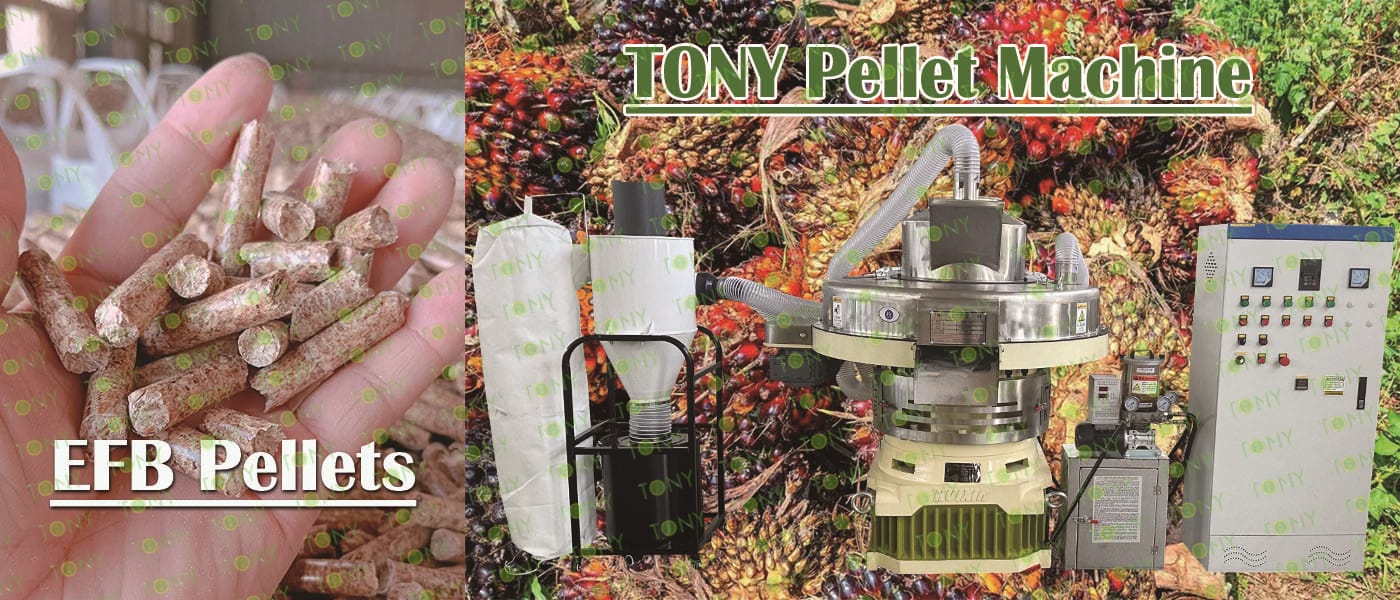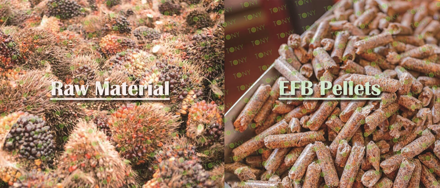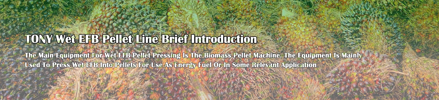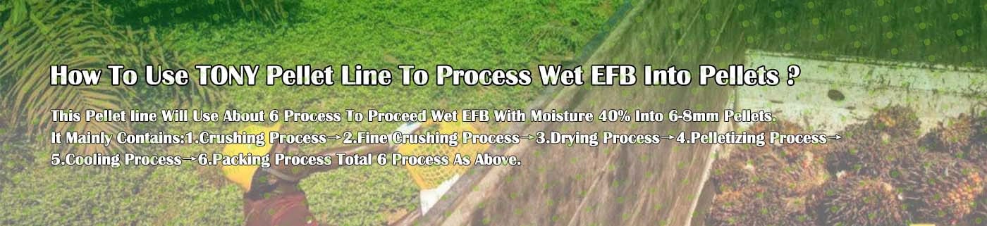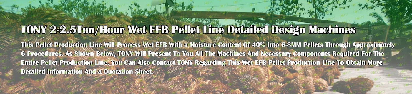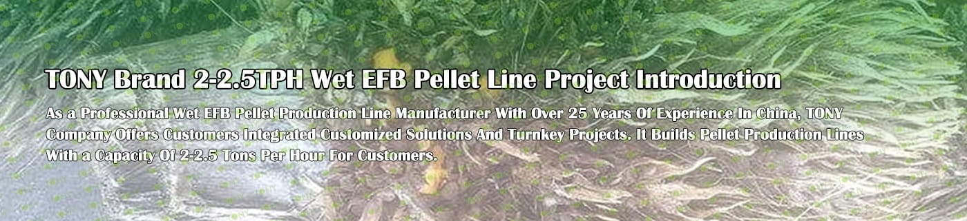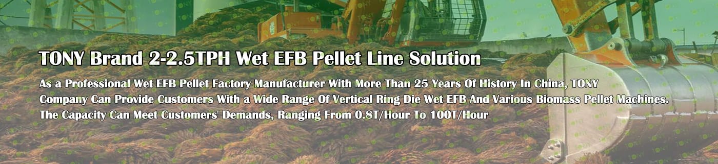 Заводът за производство на пелети с мокър EFB с марка TONY 2-2,5 тона/час може да използва мокър EFB като основна суровина. След предварителна обработка и обработка се втвърдява в пелетно гориво EFB с висока плътност. Това гориво е идеален заместител на въглищата и петрола и играе роля в енергоспестяването и намаляването на емисиите. Понастоящем той се използва широко в региони, богати на EFB ресурси.