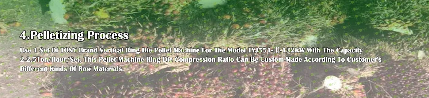 4. Основна машина: цялостна дробилка, чукова мелница, сушилня с ротационен барабан, машина за пелети TONY TYJ551-Ⅲ-132KW, охладител за пелети, опаковъчна машина и лентови транспортьори