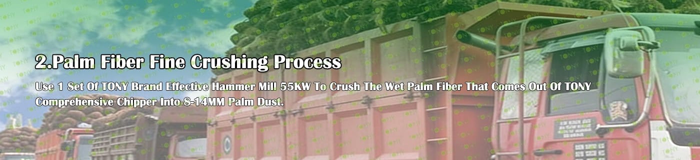 A. Този процес се използва главно за смачкване на 25-55 mm палмови влакна в 8-14 mm палмов прах.