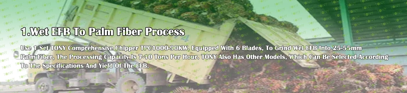 | 1. За смилане на EFB в 25-55 мм палмово влакно. 2.Модел: TPC1000-90KW с 6 Baldes*1set 3.Капацитет: 7-10 тона/час. |