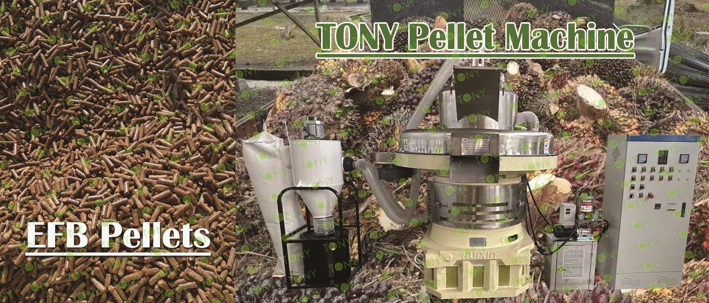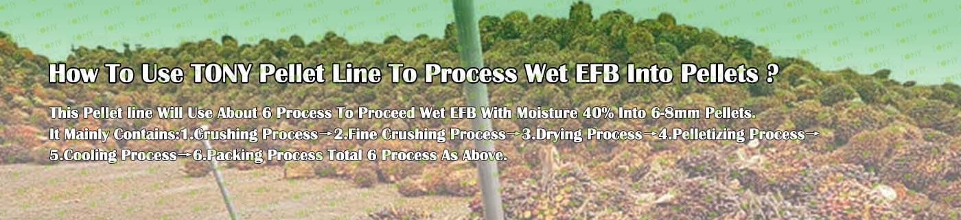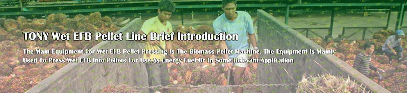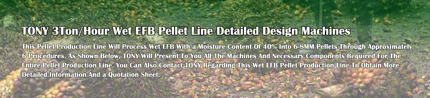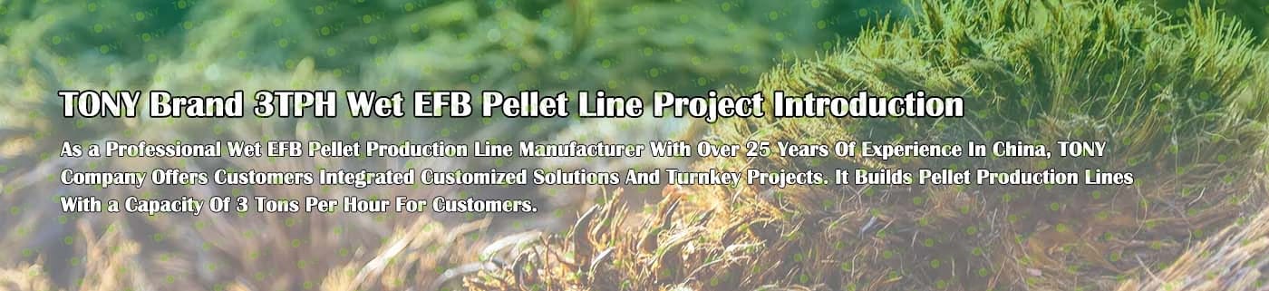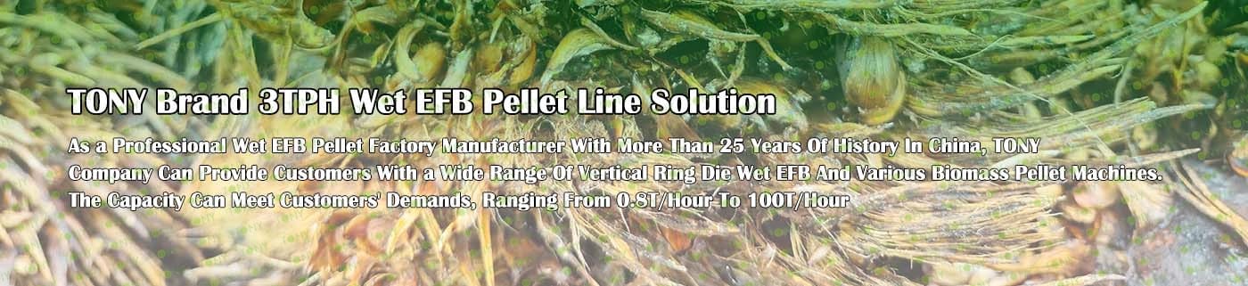 Заводът за производство на пелети с мокър EFB с марка TONY 3 тона/час може да използва мокър EFB като основна суровина. След предварителна обработка и обработка се втвърдява в пелетно гориво EFB с висока плътност. Това гориво е идеален заместител на въглищата и петрола и играе роля в енергоспестяването и намаляването на емисиите. Понастоящем той се използва широко в региони, богати на EFB ресурси.