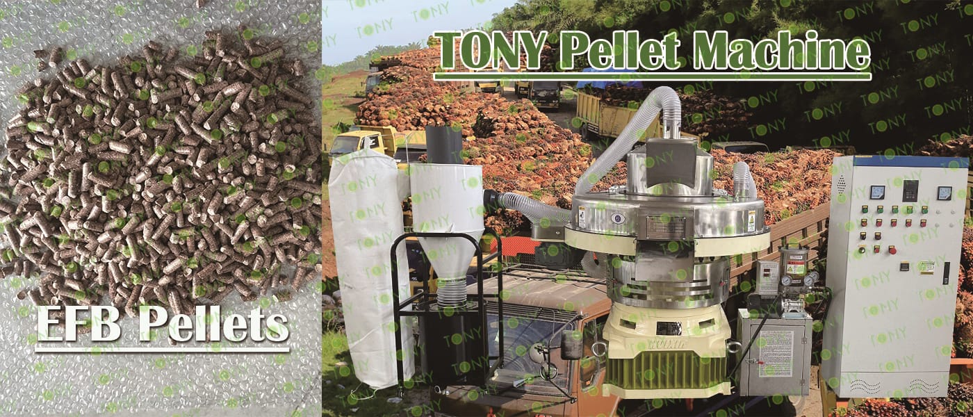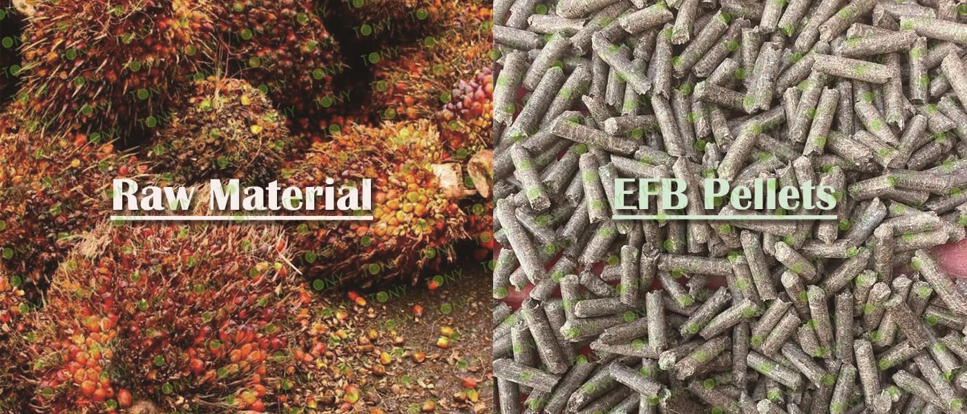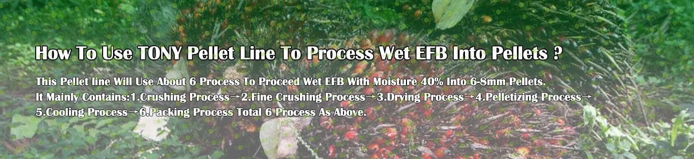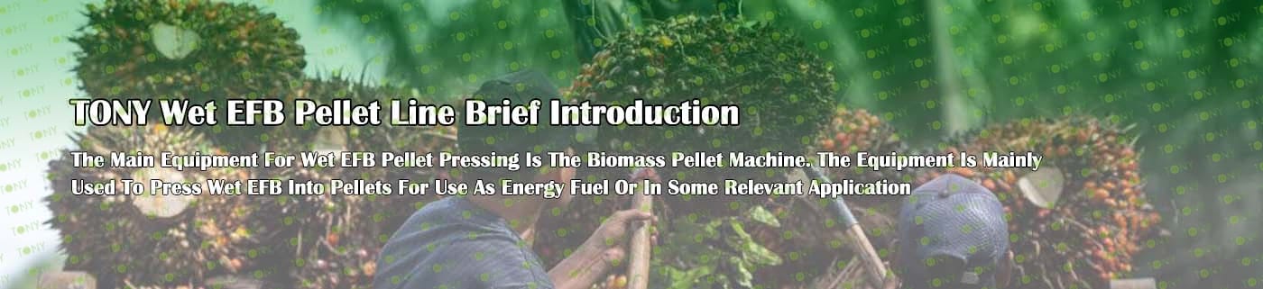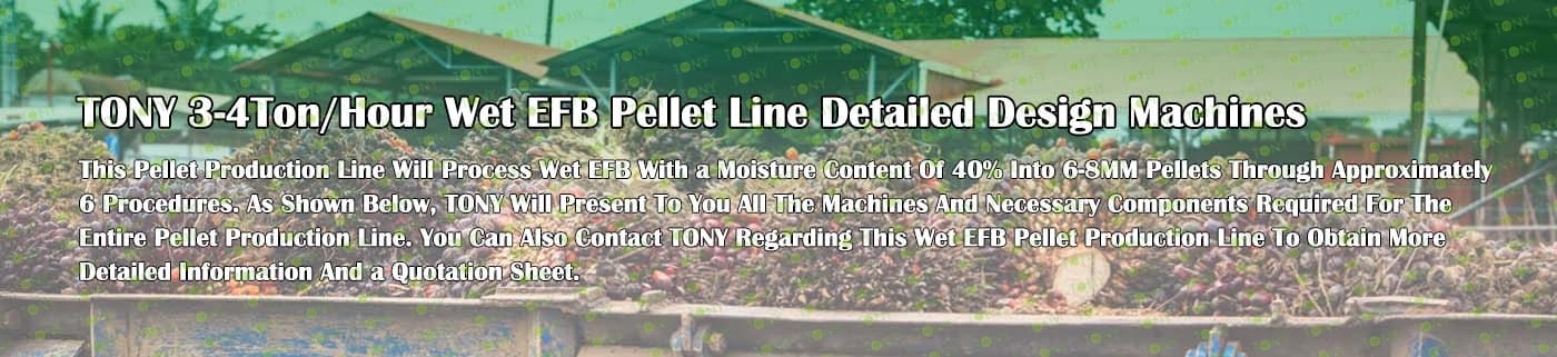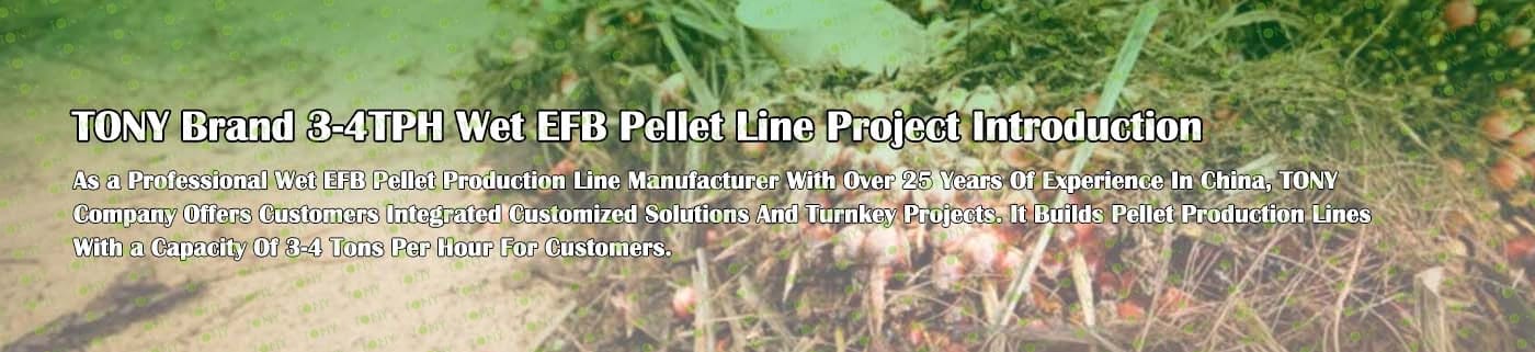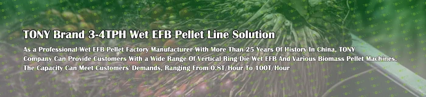 Заводът за производство на пелети с мокър EFB с марка TONY 3-4 тона/час може да използва мокър EFB като основна суровина. След предварителна обработка и обработка се втвърдява в пелетно гориво EFB с висока плътност. Това гориво е идеален заместител на въглищата и петрола и играе роля в енергоспестяването и намаляването на емисиите. Понастоящем той се използва широко в региони, богати на EFB ресурси.