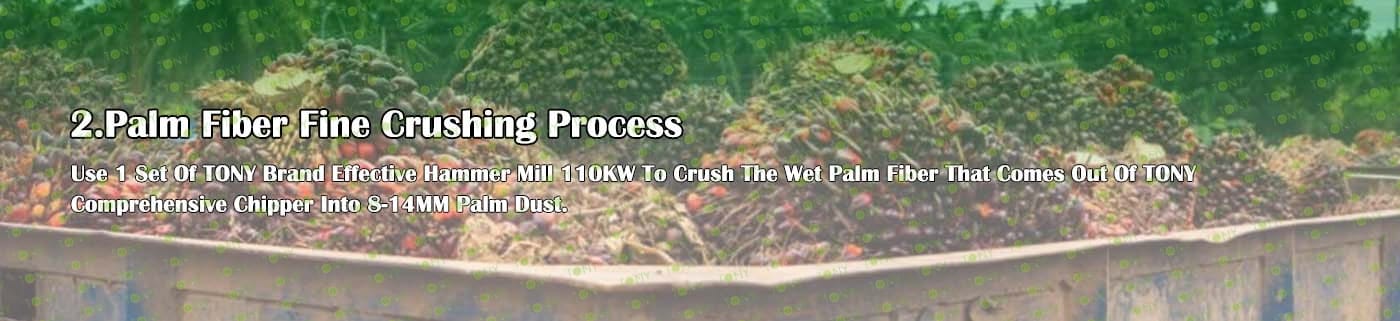 A. Този процес се използва главно за смачкване на 25-55 mm палмови влакна в 8-14 mm палмов прах.
