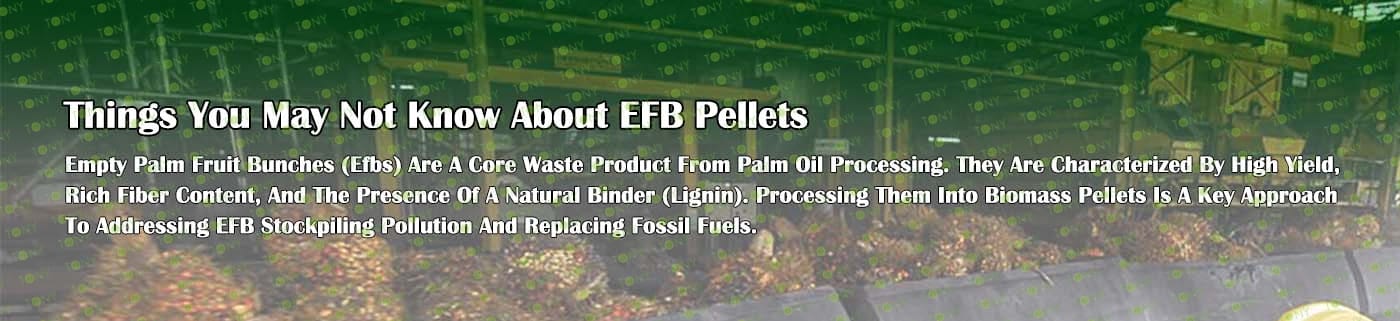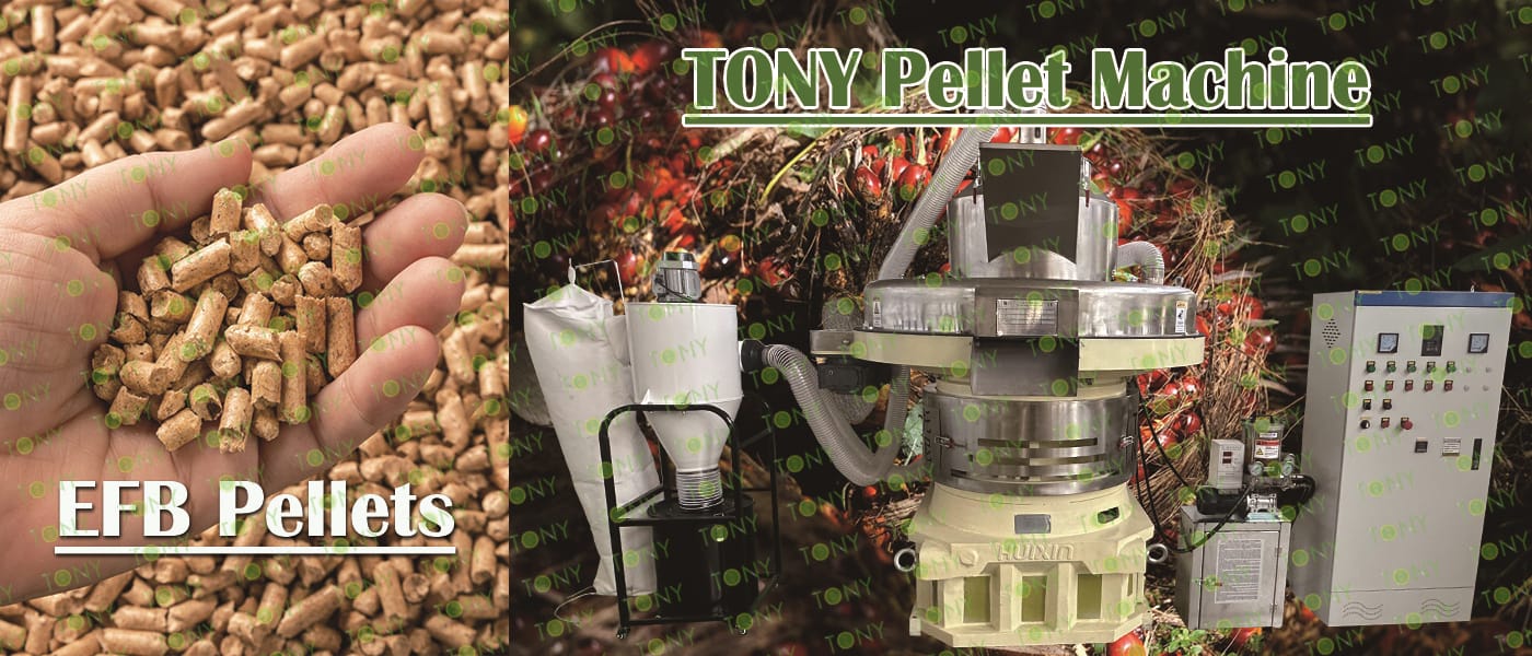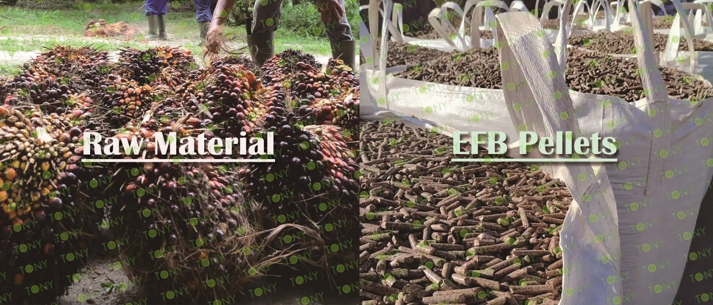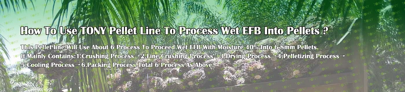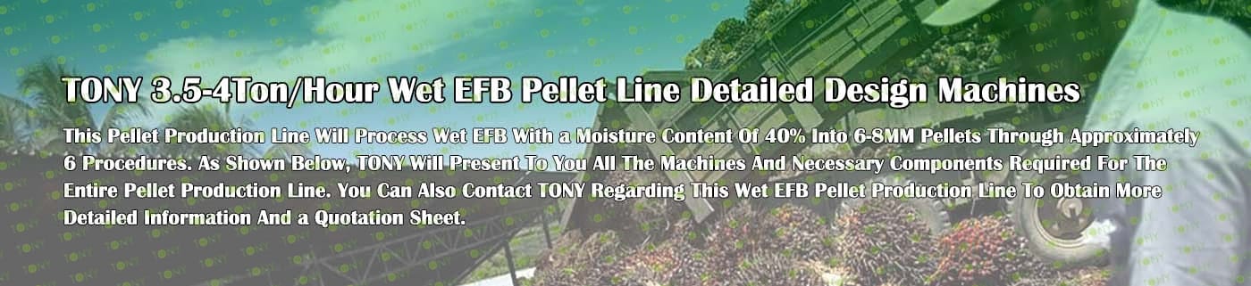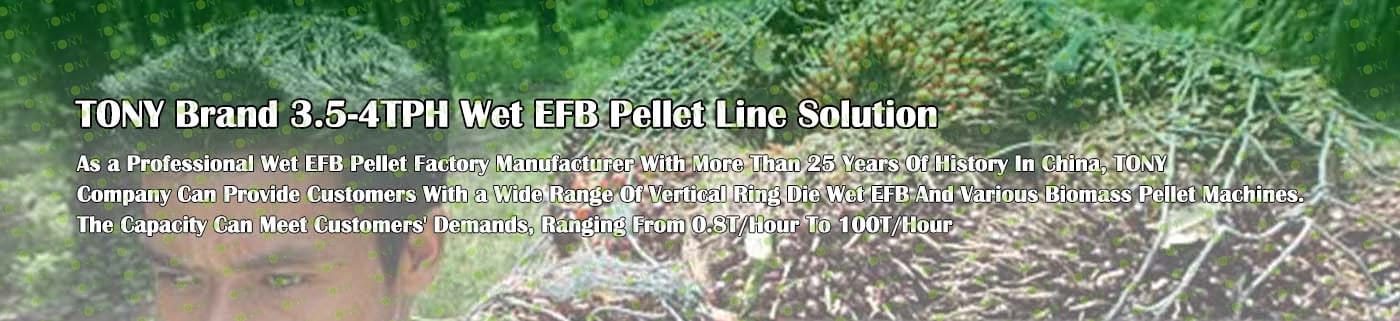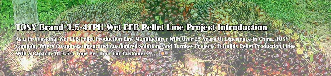 Заводът за производство на пелети с мокър EFB с марка TONY 3,5-4 тона/час може да използва мокър EFB като основна суровина. След предварителна обработка и обработка се втвърдява в пелетно гориво EFB с висока плътност. Това гориво е идеален заместител на въглищата и петрола и играе роля в енергоспестяването и намаляването на емисиите. Понастоящем той се използва широко в региони, богати на EFB ресурси.