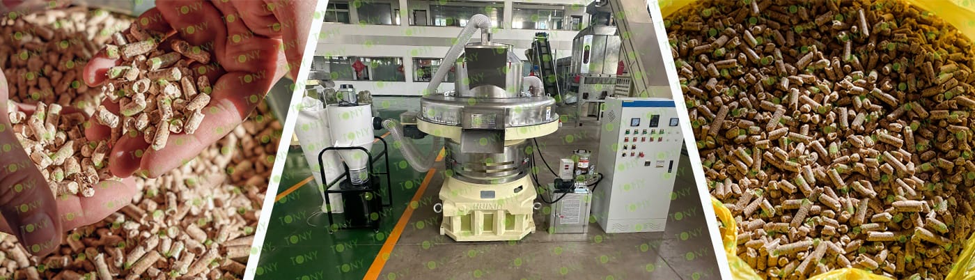 4. Основна машина: цялостна дробилка, чукова мелница, въртяща се барабанна сушилня, машина за пелети TONY TYJ860-Ⅲ-250KW, охладител за пелети, опаковъчна машина и лентови транспортьори