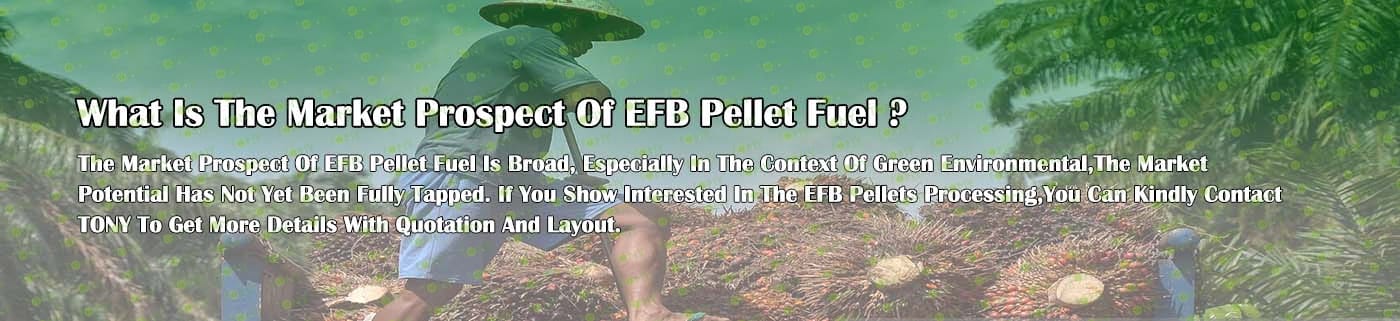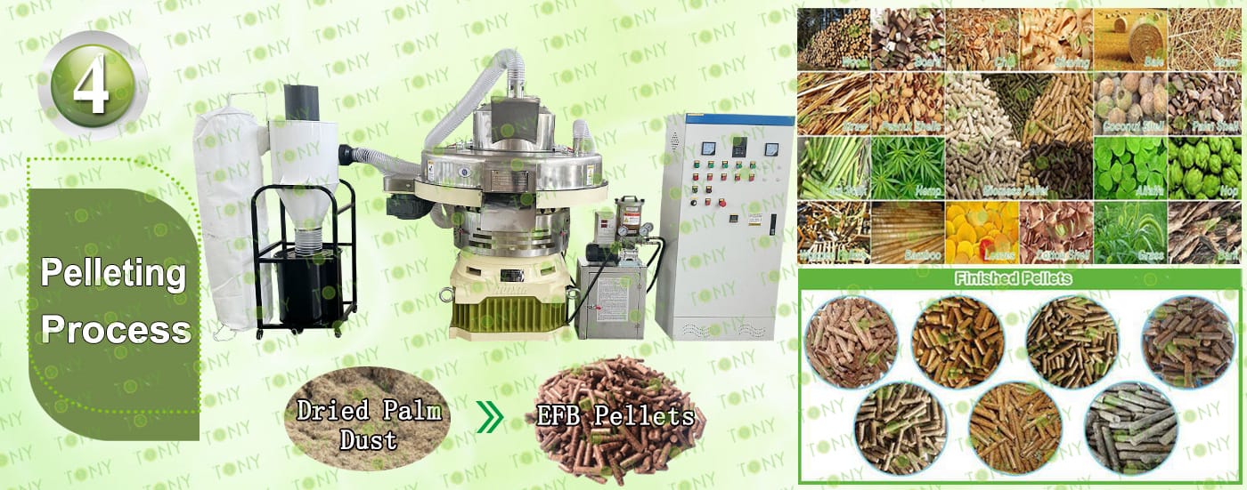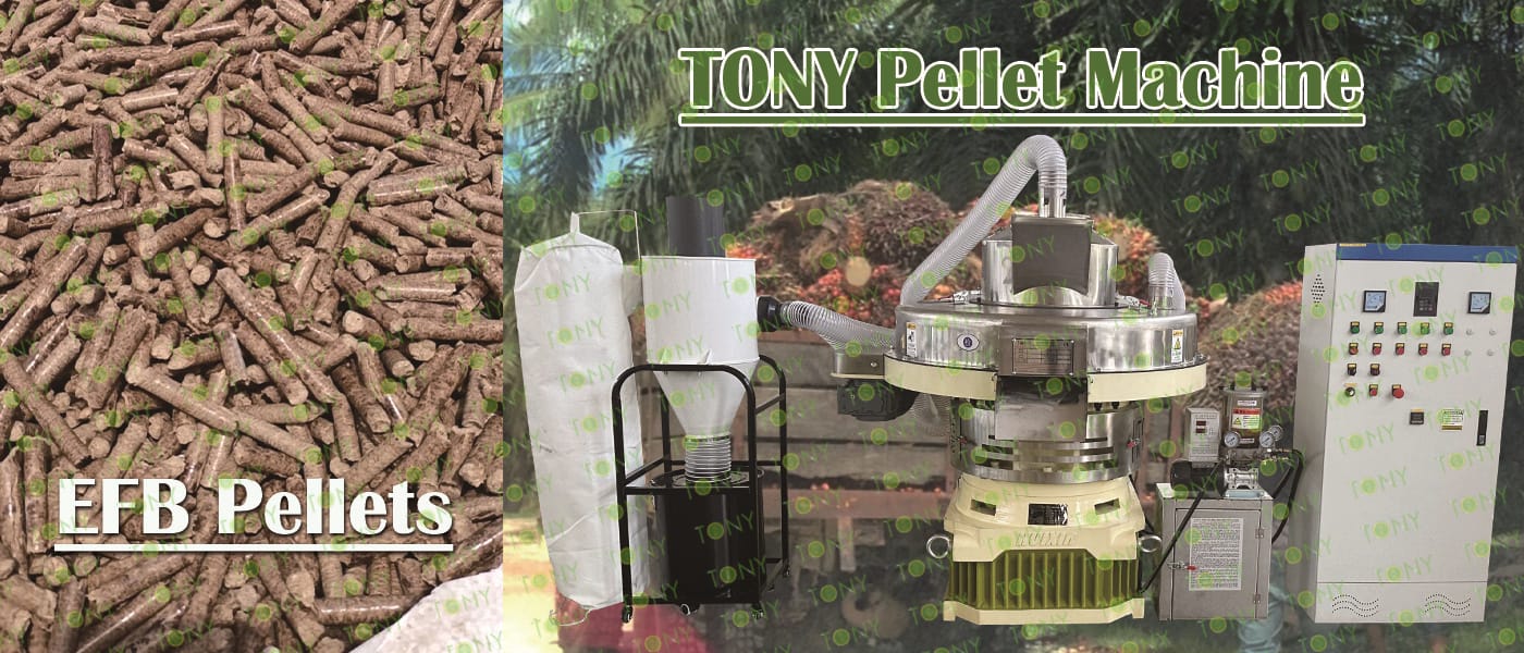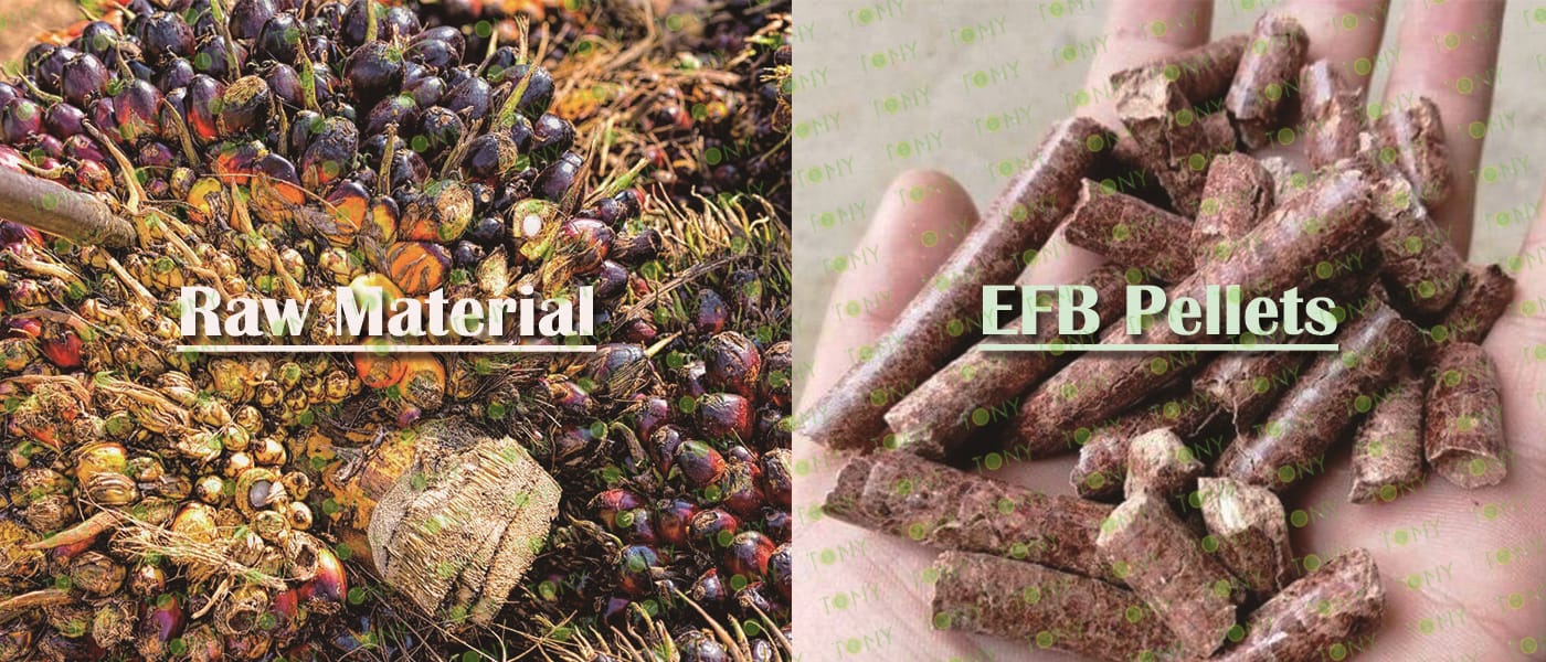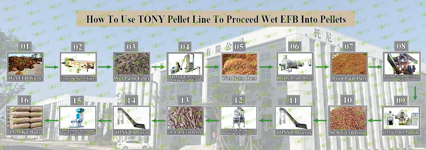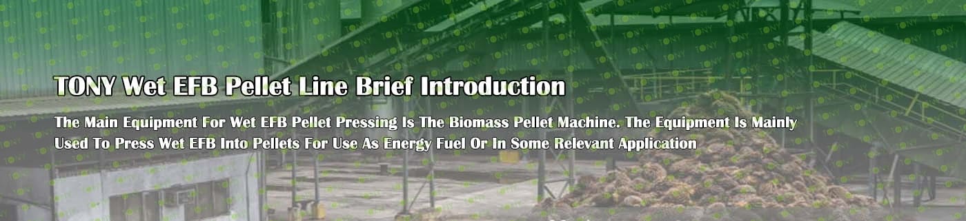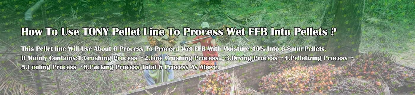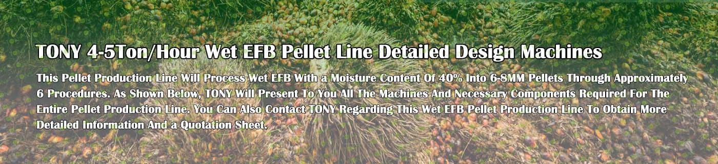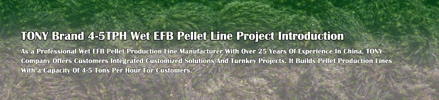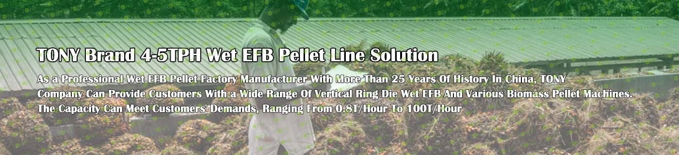 Заводът за производство на пелети с мокър EFB с марка TONY 4-5 тона/час може да използва мокър EFB като основна суровина. След предварителна обработка и обработка се втвърдява в пелетно гориво EFB с висока плътност. Това гориво е идеален заместител на въглищата и петрола и играе роля в енергоспестяването и намаляването на емисиите. Понастоящем той се използва широко в региони, богати на EFB ресурси.