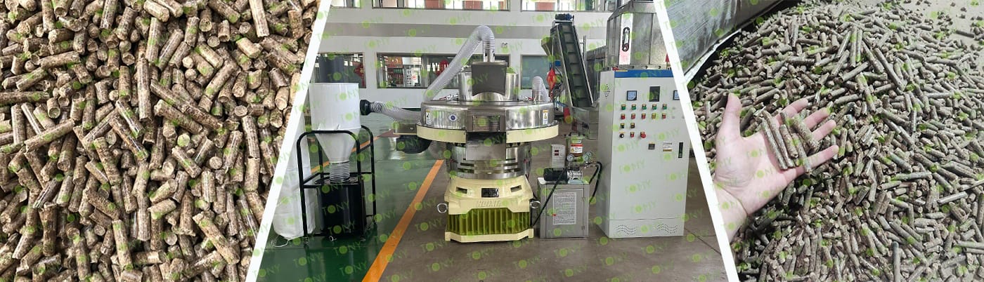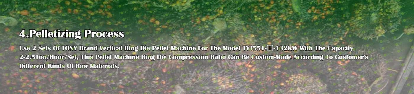 4. Основна машина: цялостна дробилка, чукова мелница, сушилня с ротационен барабан, машина за пелети TONY TYJ551-Ⅲ-132KW, охладител за пелети, опаковъчна машина и лентови транспортьори