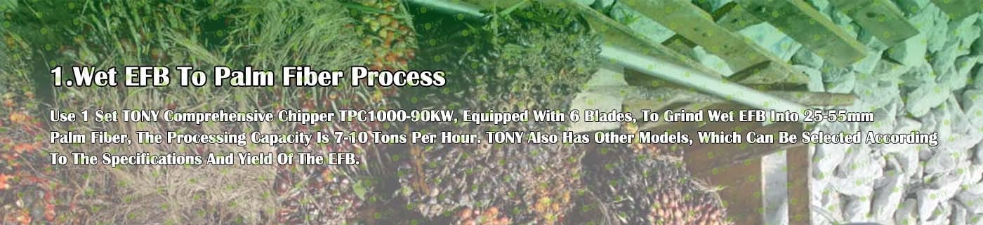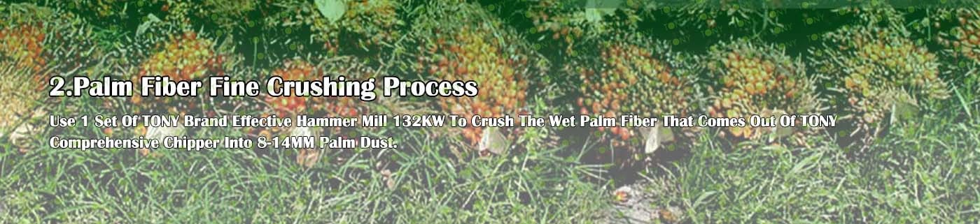 A. Този процес се използва главно за смачкване на 25-55 mm палмови влакна в 8-14 mm палмов прах.