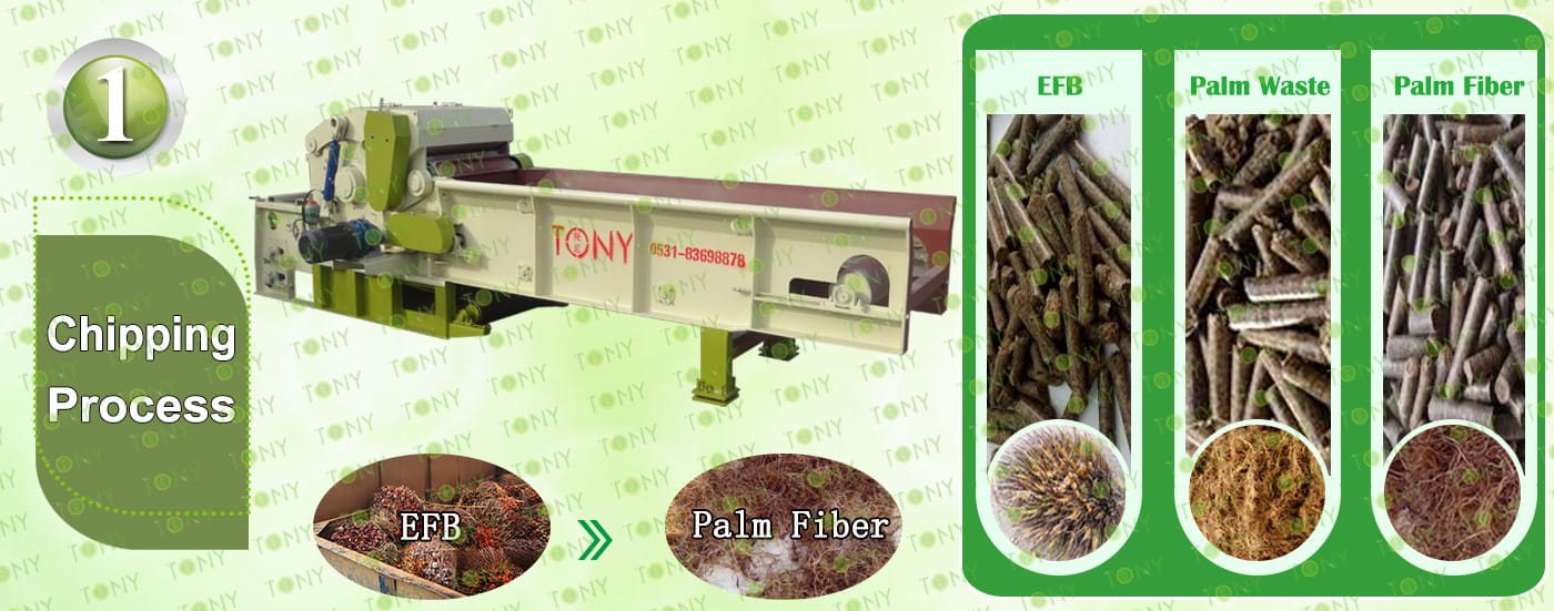 A. Този процес се използва главно за смилане на EFB в палмово влакно с размер 25-55 мм. Размерът на окончателното палмово влакно може да се регулира чрез промяна на различни размери на ситата и добавяне на летящи ножове в машината за дробене на дървесина.