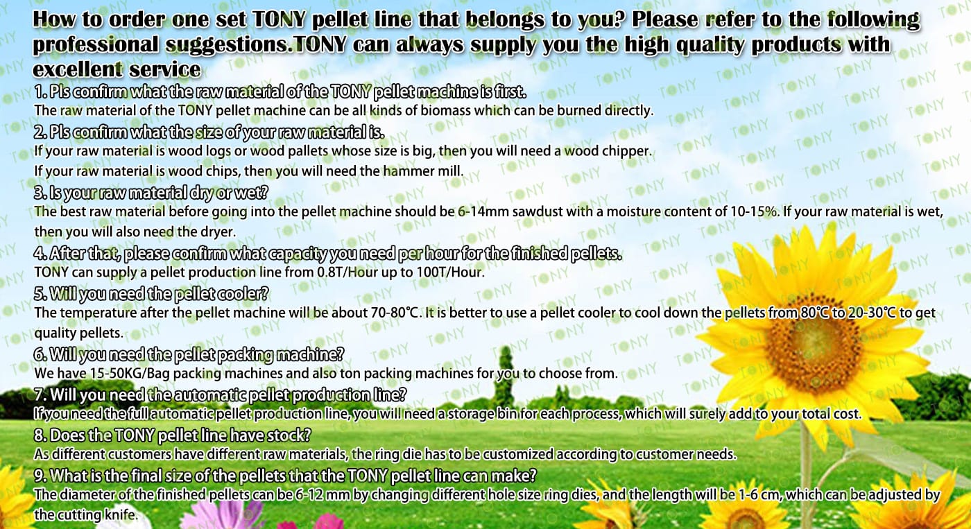 4. Основна машина: цялостна дробилка, чукова мелница, сушилня с ротационен барабан, машина за пелети TONY TYJ760-Ⅲ-185KW, охладител за пелети, опаковъчна машина и лентови транспортьори