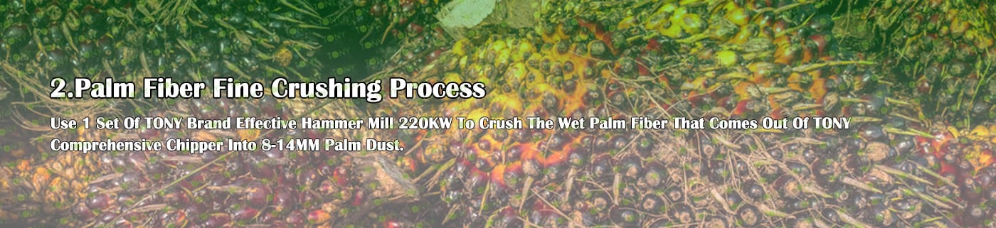 A. Този процес се използва главно за смачкване на 25-55 mm палмови влакна в 8-14 mm палмов прах.