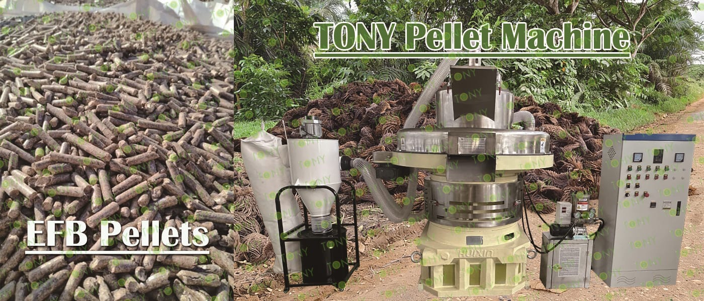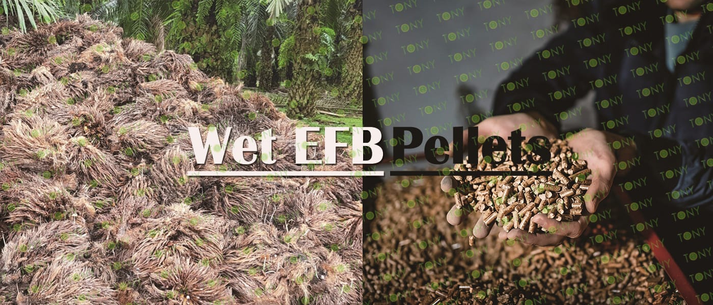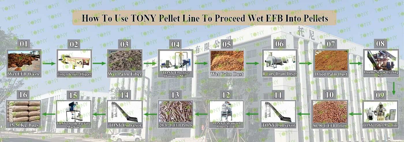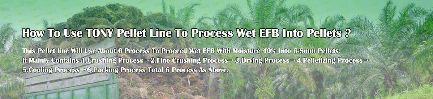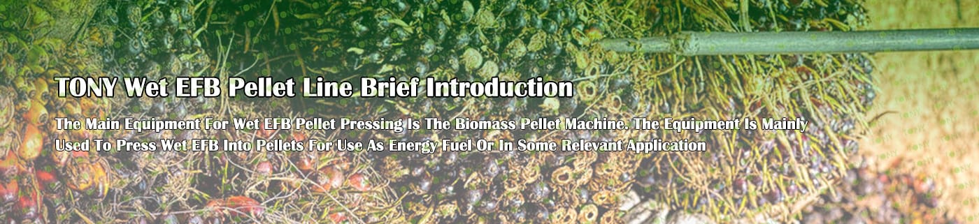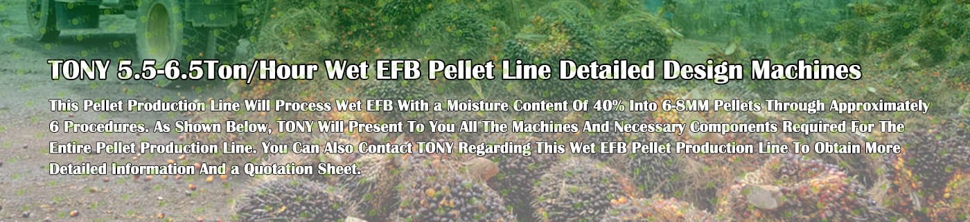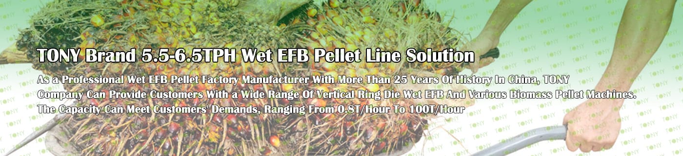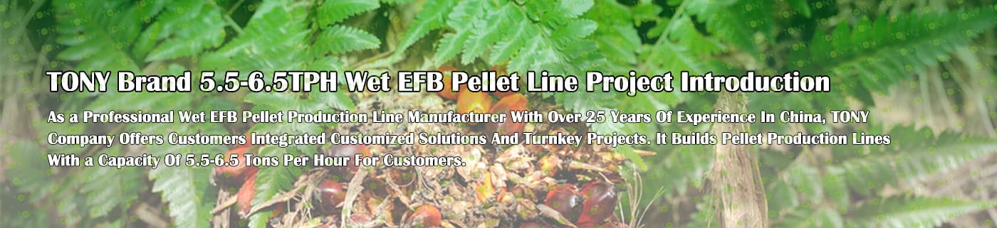 Заводът за производство на пелети с мокър EFB с марка TONY 5,5-6,5 тона/час може да използва мокър EFB като основна суровина. След предварителна обработка и обработка се втвърдява в пелетно гориво EFB с висока плътност. Това гориво е идеален заместител на въглищата и петрола и играе роля в енергоспестяването и намаляването на емисиите. Понастоящем той се използва широко в региони, богати на EFB ресурси.