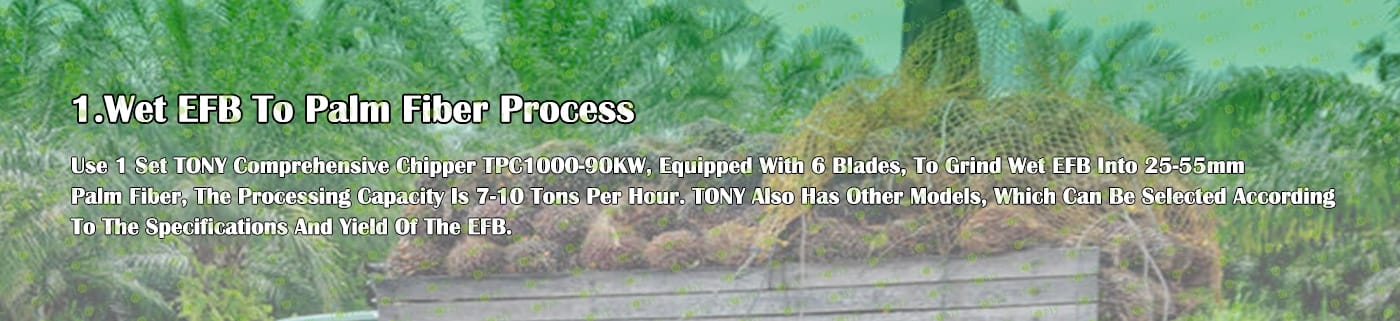 A. Този процес се използва главно за смилане на EFB в палмово влакно с размер 25-55 мм. Размерът на окончателното палмово влакно може да се регулира чрез промяна на различни размери на ситата и добавяне на летящи ножове в машината за дробене на дървесина.